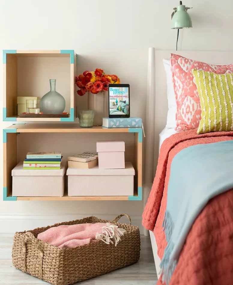 Если вам нужно немного дополнительного места для хранения, измените назначение неглубокой корзины, желательно с ручками, которую можно легко засунуть под кровать. Используйте его, чтобы спрятать предметы, к которым вы регулярно обращаетесь, но которые не помещаются в вашей тумбочке или на ней.