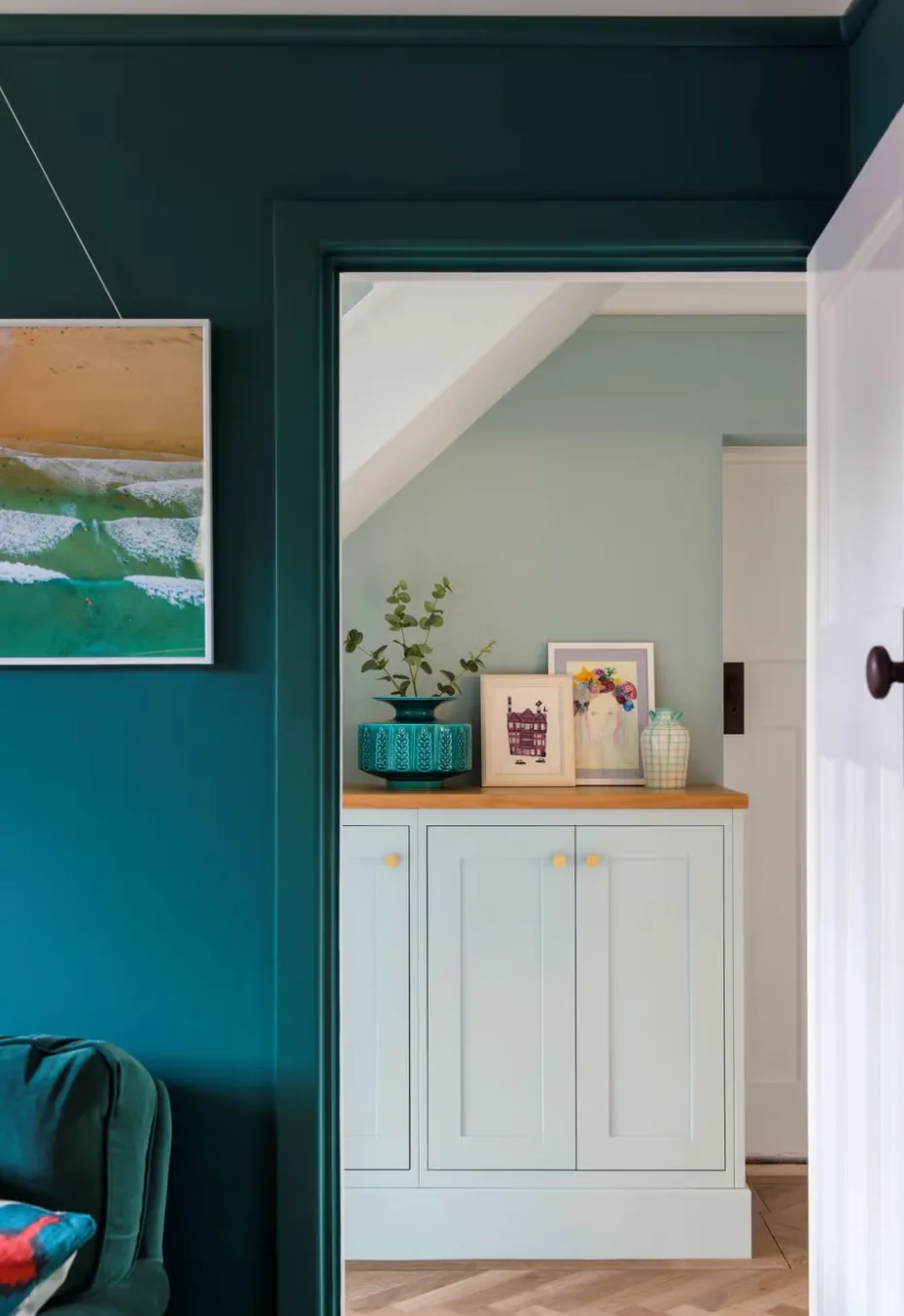 Можно выбирать оттенки в пределах одной цветовой группы, чтобы создать последовательный поток от комнаты к комнате. Например, на фото бледно-мятный зеленый с белым используется в узкой прихожей, делая его светлым и просторным, и он идеально дополняет темный темно-зеленый цвет в соседней гостиной.
