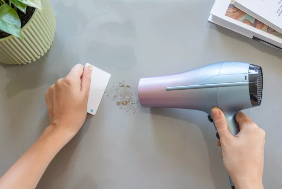 Начните с того, что нагрейте след от скотча с помощью фена. Тепло размягчит клей, и его будет легче снять. Держите фен на средней температуре примерно 15 – 20 секунд, не поднося его слишком близко к стене, чтобы не повредить краску.