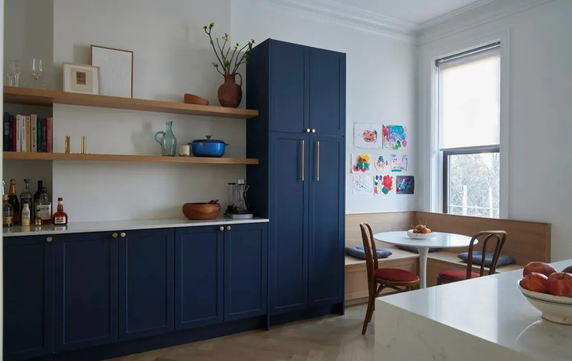 Темно-синий цвет кухонного шкафа является насыщенным и изящным. Такой оттенок предлагает смелую, но универсальную альтернативу нейтральным тонам. Он придает кухне стильный и элегантный вид.
