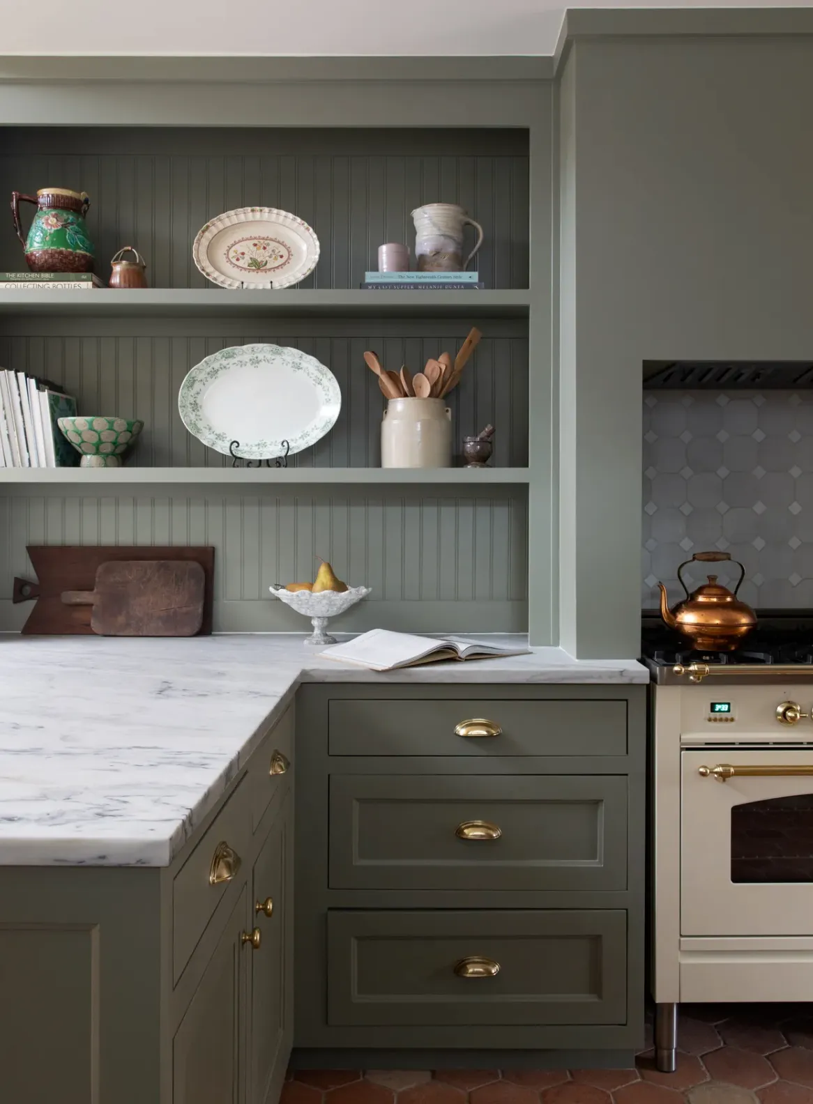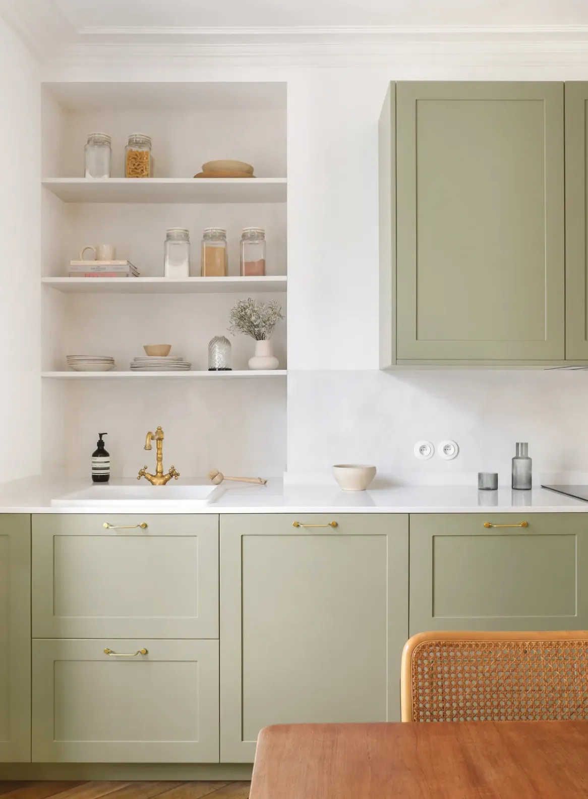 Кухонные шкафы в цвете зеленого шалфея придают мягкую и приземленную атмосферу.