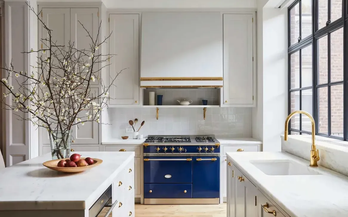 Ключ к созданию белой кухни, которая выглядит вневременной и привлекательной, заключается в контрастных акцентах. Например, темно-синяя плита и латунные акценты, которые добавляют цвета и текстуры дизайну.