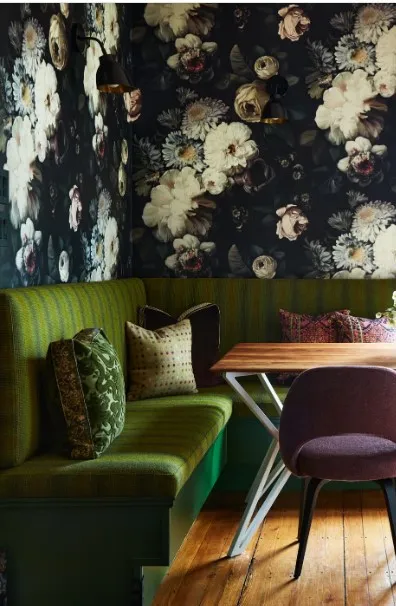 Эксперт в дизайне Эмбер Хайтон считает, что есть что-то величественное и одновременно уютное в сочетании фиолетового и зеленого в интерьере. По его словам, эти оттенки так же непринужденно сочетается в интерьере дома, как и в природе. Дизайнер использовала эти цвета в смежной столовой и гостиной с однотонными элементами и миксом узоров, дополненных черными, бежевыми и латунными акцентами, что создало легкий, изысканный вид.