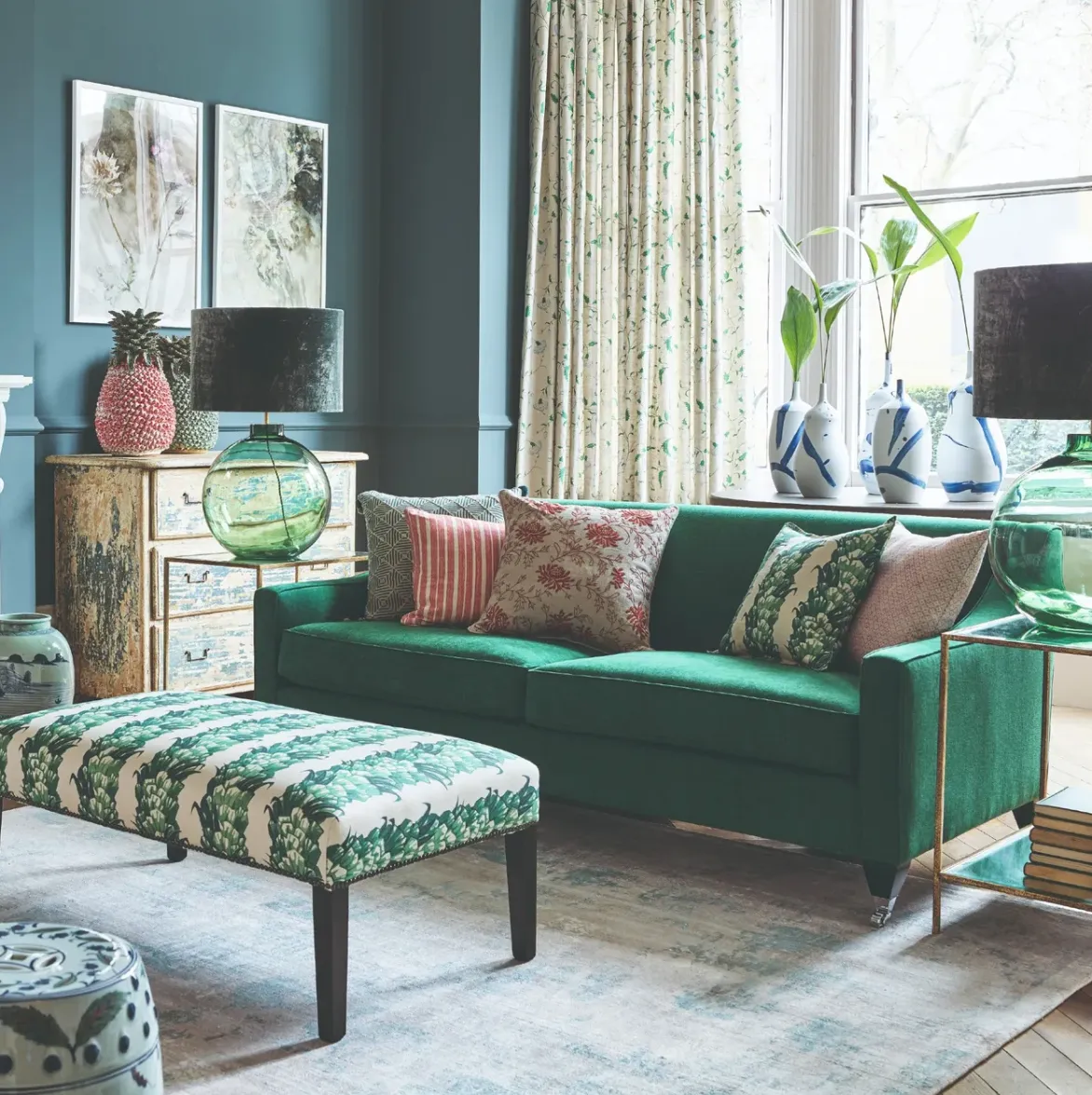 Дизайнеры сходятся во мнении, что синие, зеленые и коричневые, темных оттенков серые, диваны прекрасно подходят для вплетения в нейтральные схемы гостиной.