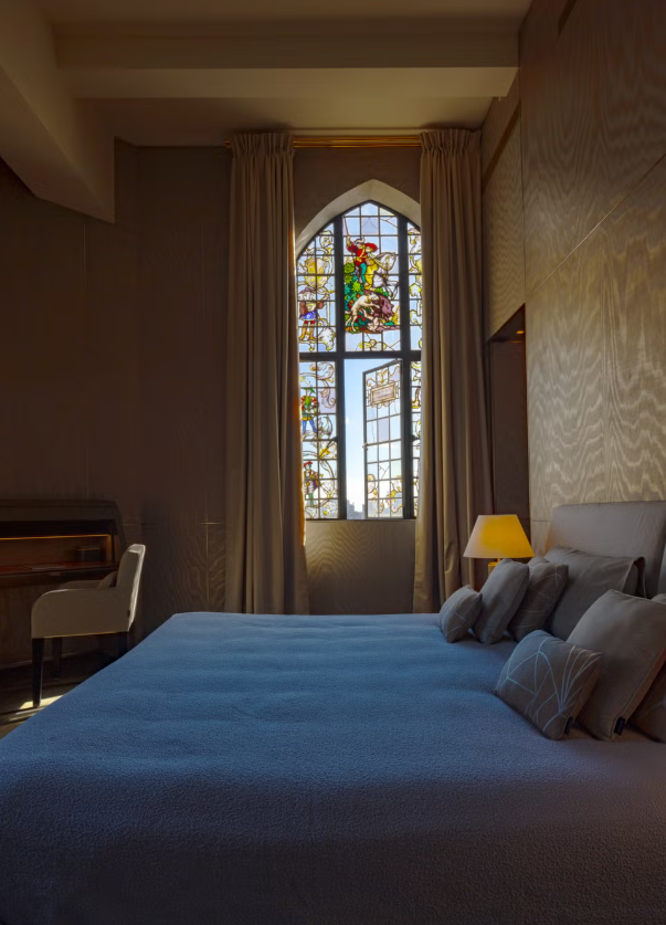 Оригинальные витражные окна 1920-х годов в гостевой комнате выходят на Центральный парк в нью-йоркском пентхаусе Джорджио Армани / Фото Todd Eberle