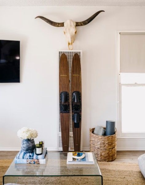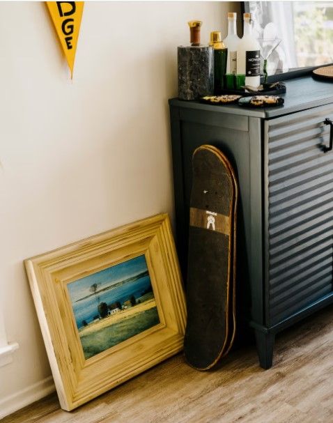 Из-за напряженного графика путешествий Вуда, его квартиру меблировали во время остановок между турами. Одни выходные – это кофейный столик, следующие – барные стулья. Винтажное искусство в столовой стало первой покупкой, которую он сделал, когда наткнулся на распродажу имущества в свою первую неделю в этом районе. Это быстро стало отправной точкой для всей палитры дома.