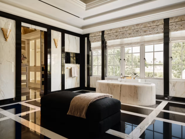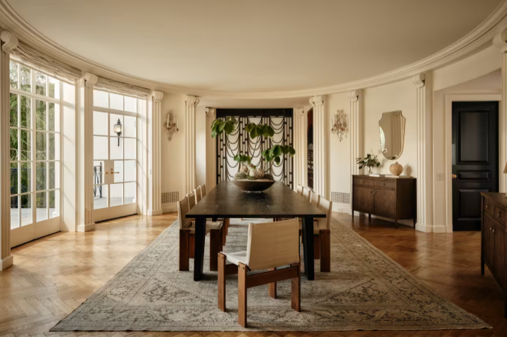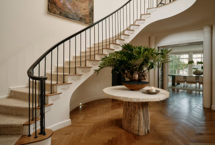 Гостей в доме встречает вестибюль с паркетом в елочку и элегантной лестницей. Прямо за входом – формальная столовая столовая с панорамными окнами, выходящими на участок. В доме также есть просторная гостиная, библиотека и бильярдная с деревянными панелями, украшенными в стиле ар-деко по мотивам дизайнера Эмиля-Жака Рюльмана.