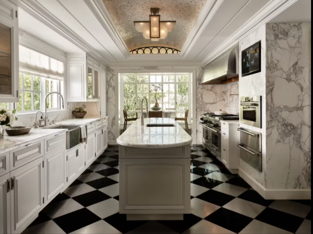 На первом этаже также расположен бар с деревянной отделкой и утренняя комната с оригинальным камином и обоями XVIII века. Кухня из мрамора имеет клетчатый пол в черно-белых тонах, две мойки, две духовки и обеденную зону с окнами.