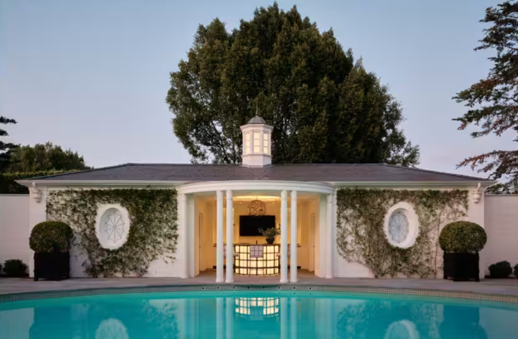 Дом был спроектирован известным архитектором Полом Уильямсом и завершен в 1938 году. Изначально он был построен для мэра Беверли-Хиллз и застройщика Эдварда Пола Денцеля. Точная дата, когда Разерфорд и ее муж Уильям Дозье переехали сюда, неизвестна, но в поместье они проводили многочисленные свадьбы, из-за чего дом получил прозвище "Часовня Гринвей", передает 24 Канал со ссылкой на Mansion Global.