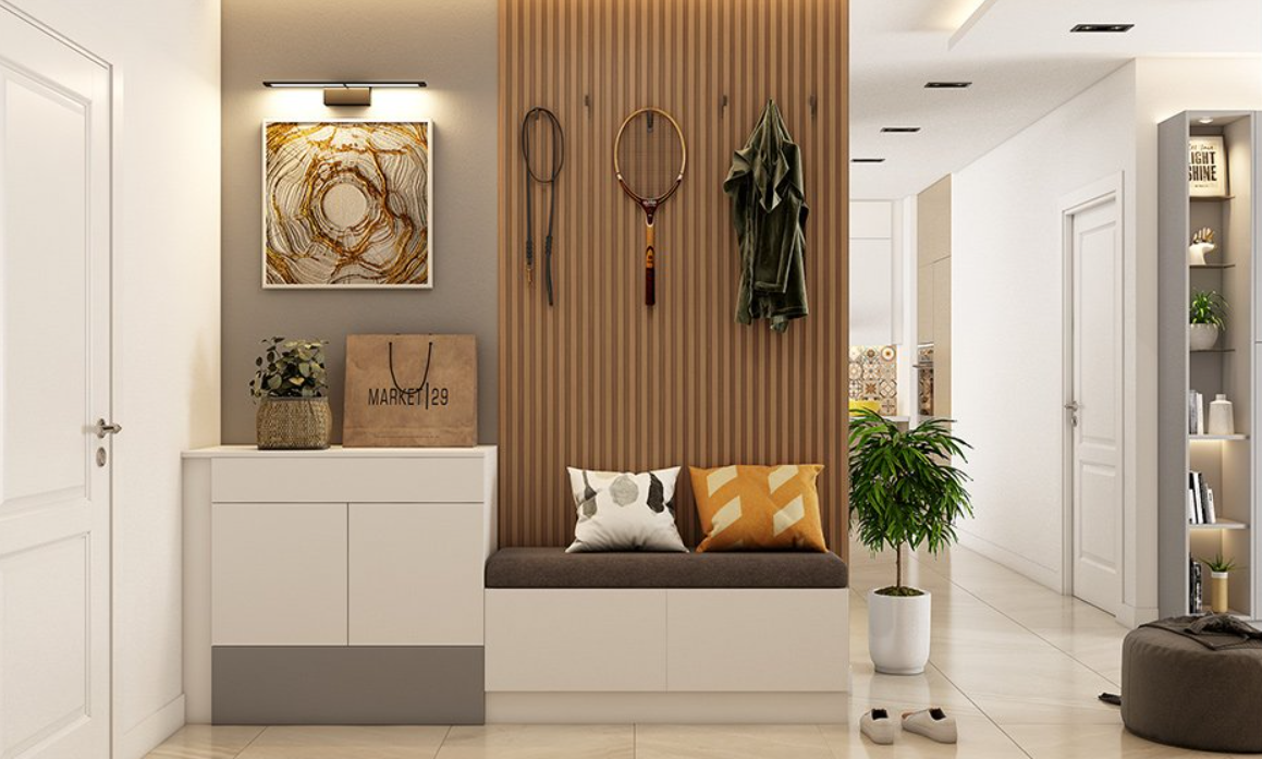 Чтобы избежать беспорядка, добавьте возможности для хранения в прихожей. Это позволит скрыть все необходимые вещи.