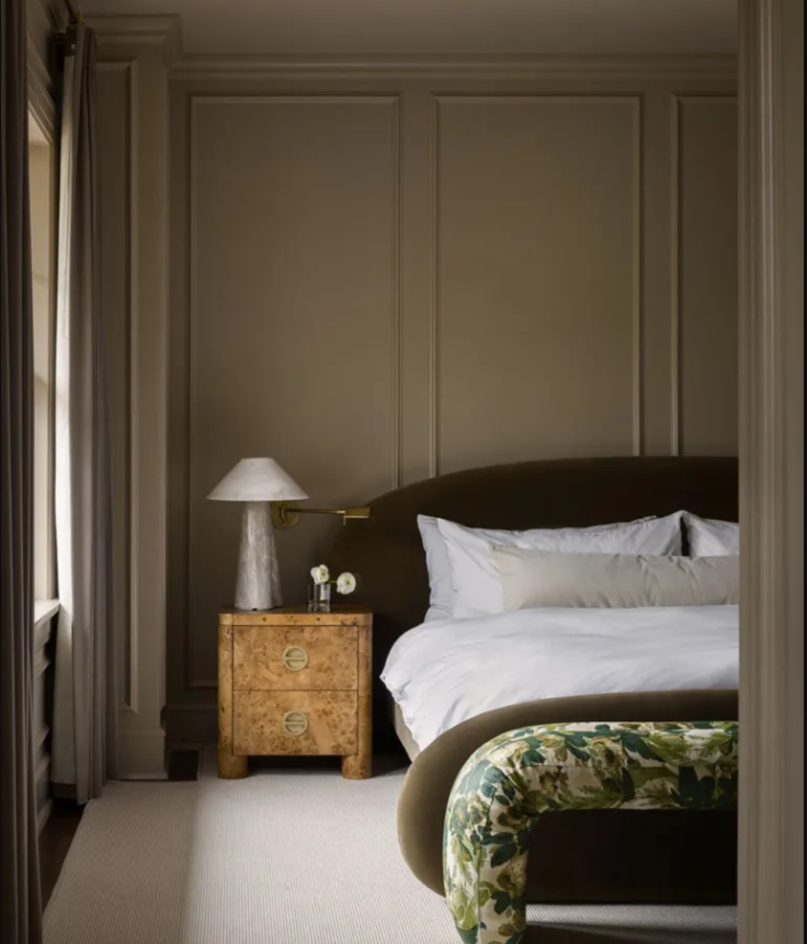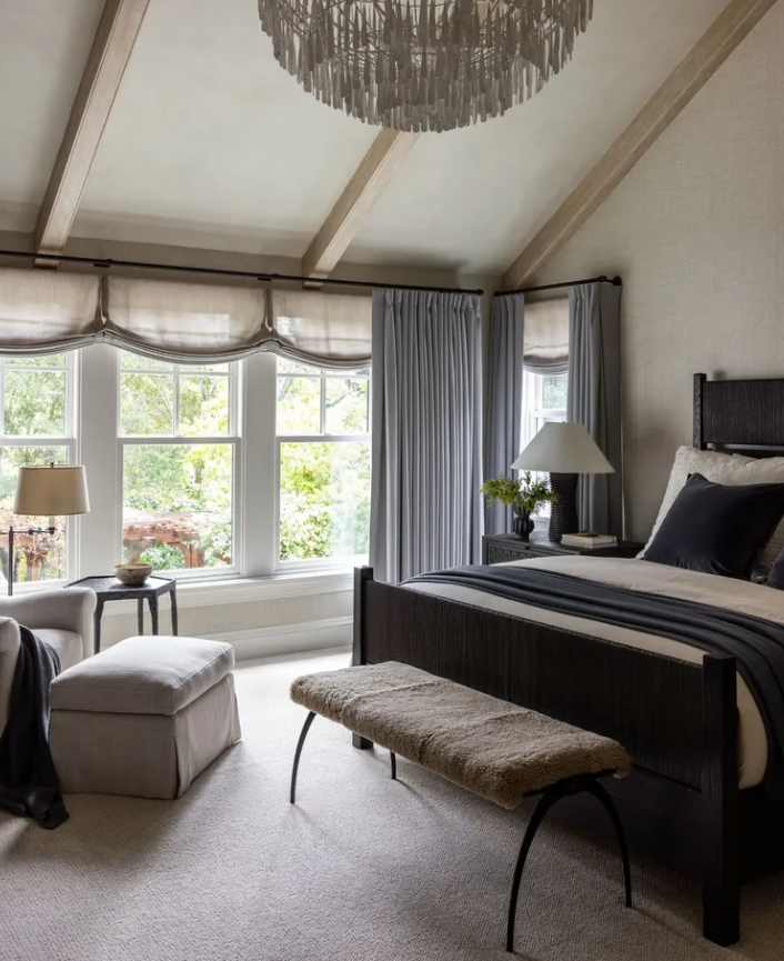 В этой спальне сочетается таупе с кремовым, добавив насыщенный темно-синий на подушках и пледе из альпаки – это заякоривает нейтральные тона и привлекает внимание"
