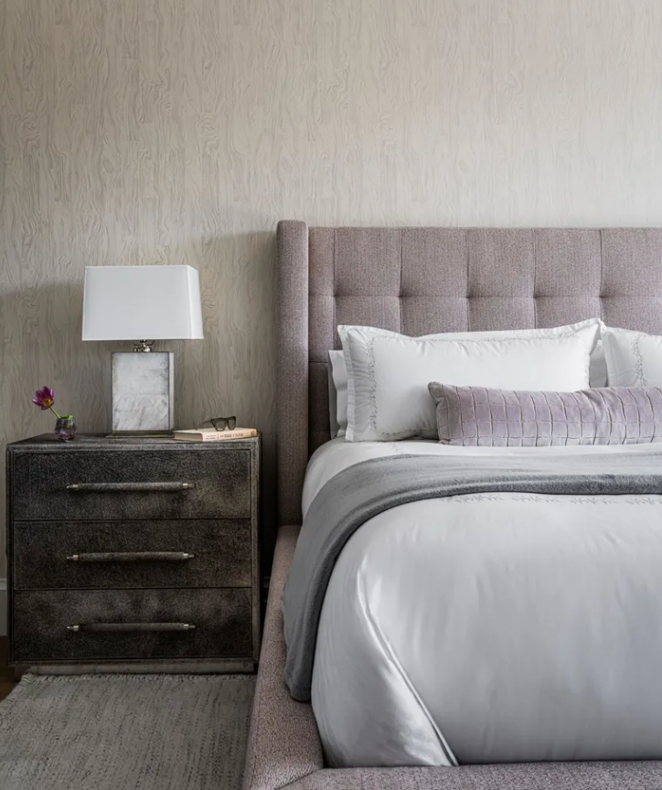 Лавандовое изголовье добавляет деликатного цвета к стенам в цвете таупе, сохраняя мягкое и ненавязчивое настроение / Фото Czar Interiors, V. Reyes Photography