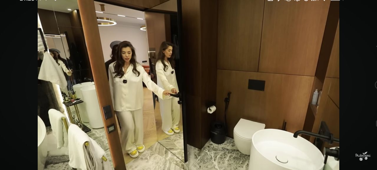 Ванная комнаты модели оформлена в современном минималистическом стиле с акцентом на роскошные материалы и теплые оттенки.