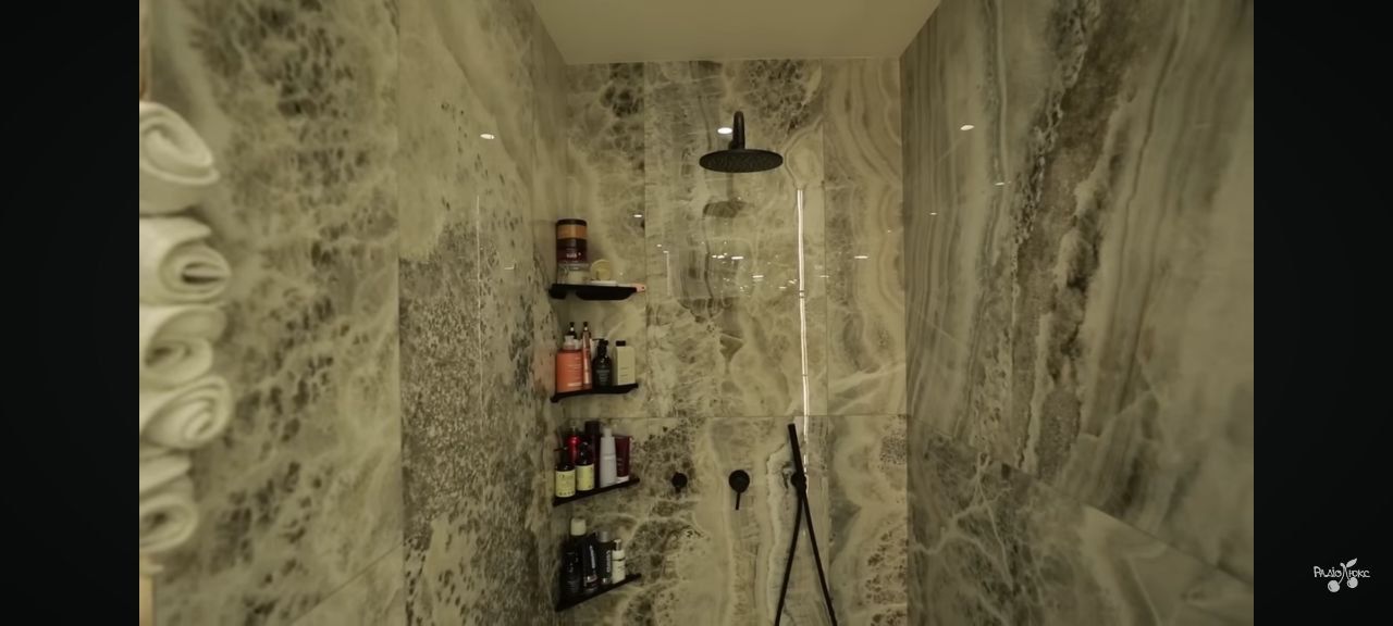 Душевая зона в интерьере ванной Анны Неплях поражает роскошным выбором отделки и продуманностью деталей. Стены полностью облицованы большими плитами из полированного камня с выразительным узором, который напоминает минеральные срезы или мрамор с глубокими серыми, кремовыми и графитовыми прожилками. Эта текстура добавляет пространству глубины и динамики, одновременно создавая впечатление дорогой спа-зоны.