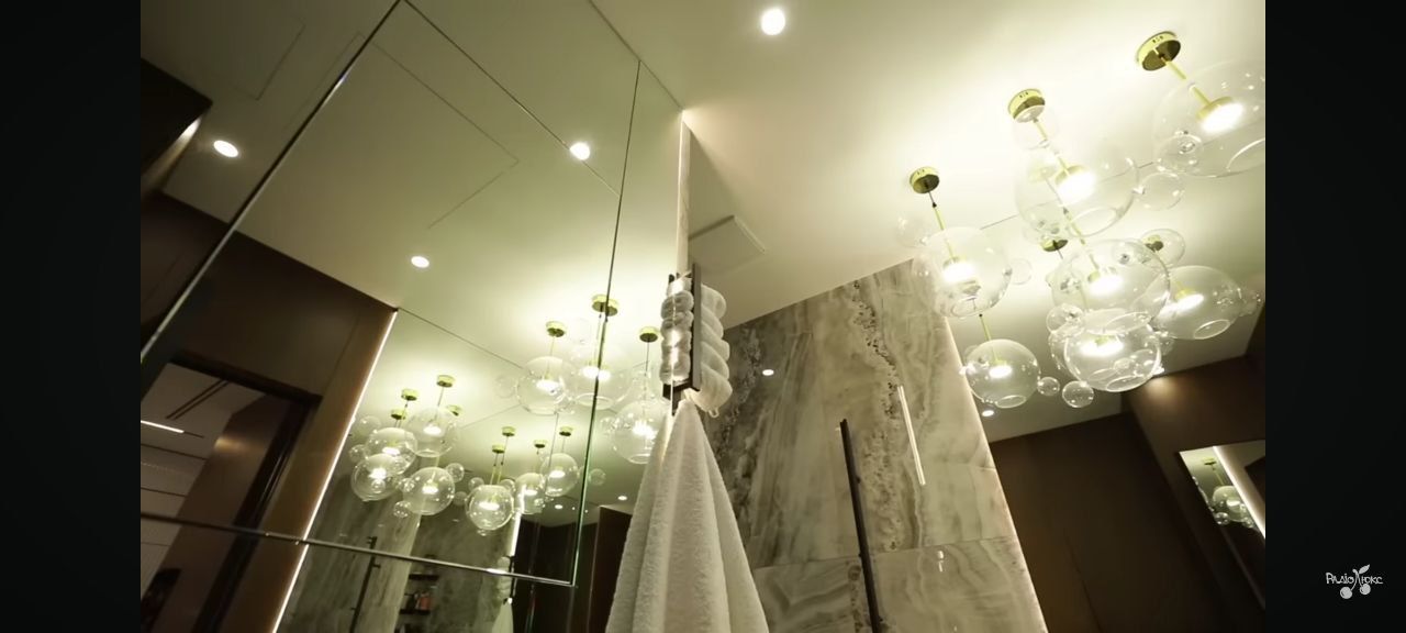 Потолок украшен уникальным светильником из стеклянных шариков разного размера, создающих эффект мыльных пузырей. Стену с мраморной плиткой с ярко выраженным природным узором подсвечено точечными светильниками и линейной LED-подсветкой. Зеркала на стенах не только визуально расширяют пространство, но и отражают свет, усиливая ощущение глубины и сияния. Вся композиция потолка, света и материалов работает на создание эстетики современного гостиничного люкса.