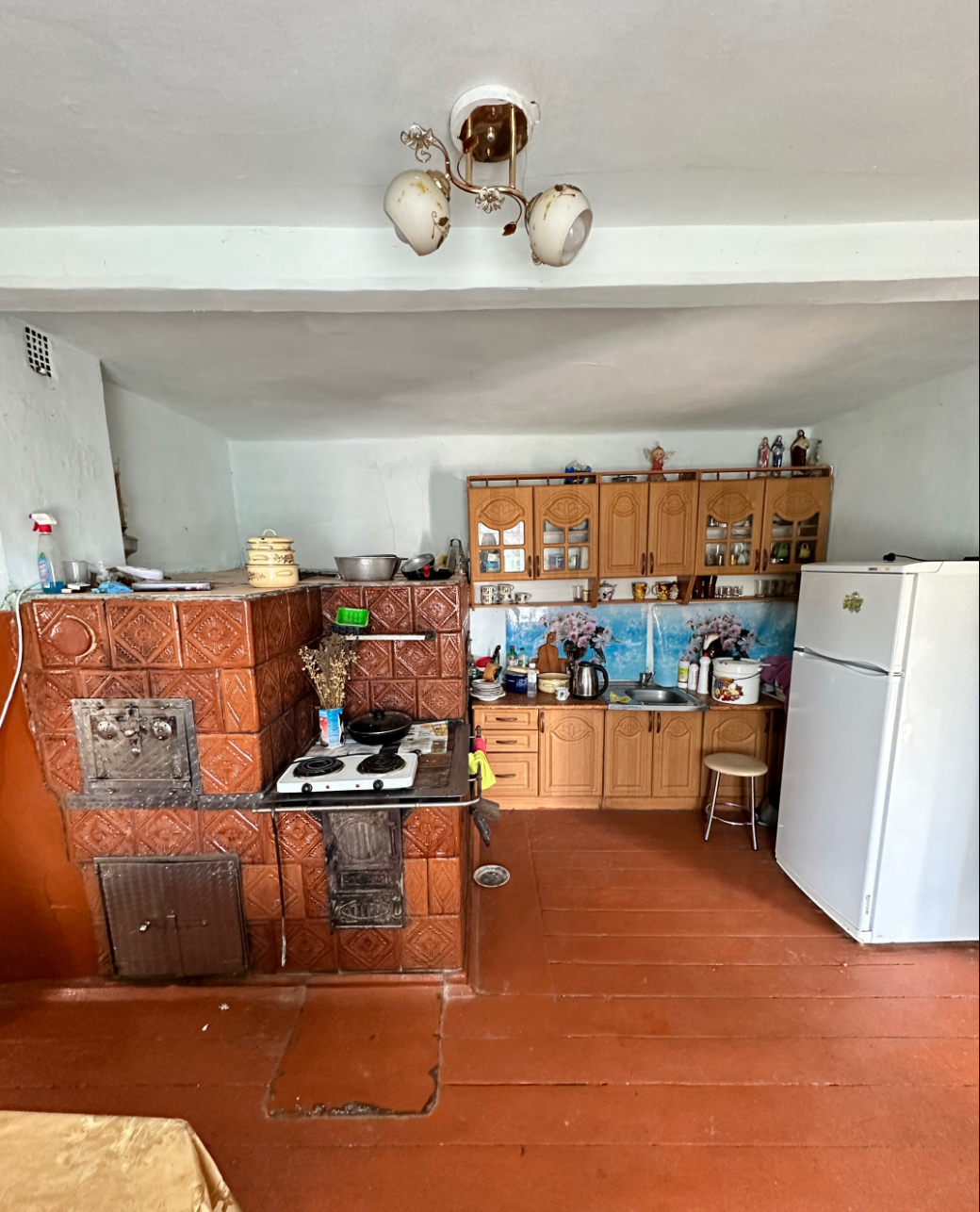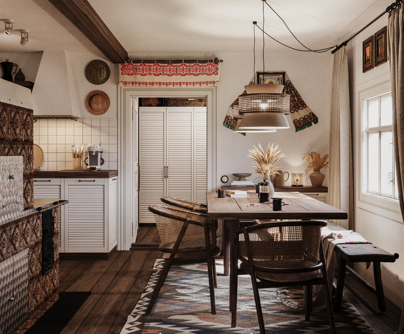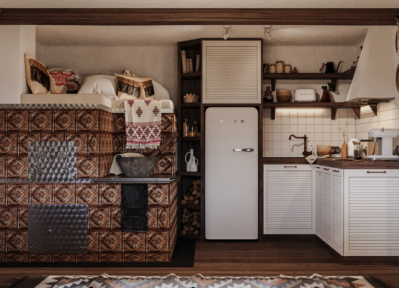 Дизайнери вирішили повністю осучаснити інтер'єр, але при цьому залишити його традиційним. В основі інтер'єру – дерево та білий колір. У кухні залишили піч, але замінили кахель на новий, що одразу додало інтер'єру стилю. На кухні білі фасади доповнили дерев'яною стільницею і білим фартухом з плитки. Кольори пічки та кухні були у тон до дерев'яної підлоги.