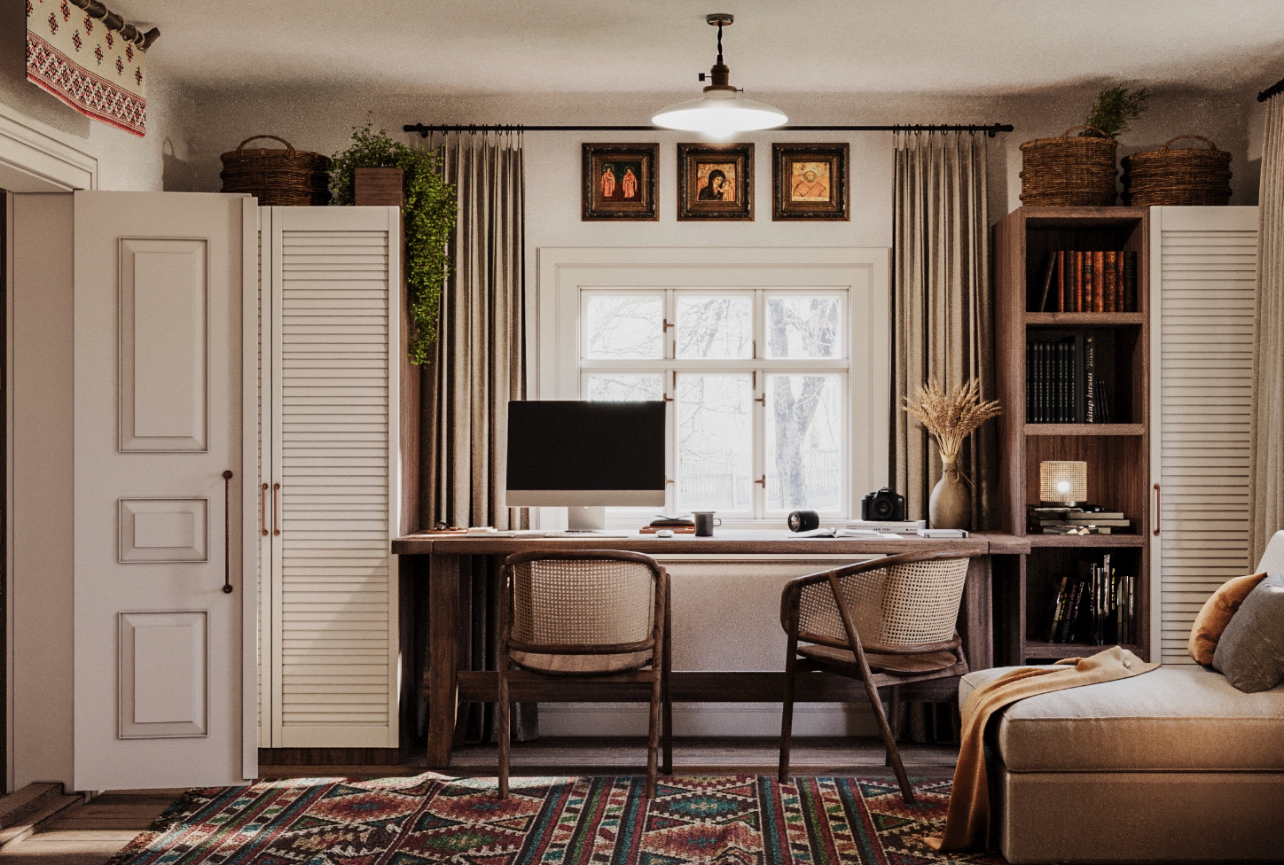У спальні перемалювали стіни та повністю замінили меблі. Навпроти вікна, як і раніше, поставили робочий стіл, а поруч – шафу для книг. Ікони та килим з орнаментами додали відчуття "як у дитинстві".