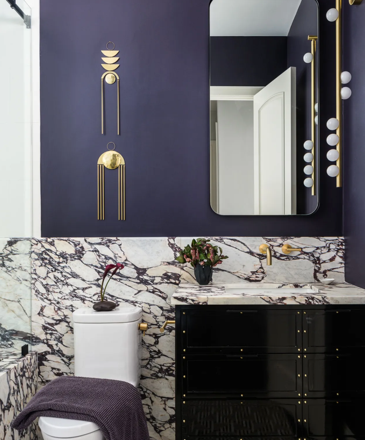 Насичені та примхливі відтінки. У 2025 році темні й похмурі ванні кімнати будуть користуватися значним попитом, пропонуючи насичену й драматичну атмосферу простору. Такі кольори, як чорний, насичено-фіолетовий і сливовий, є особливо привабливими – вони випромінюють сміливість та елегантність. Ці відтінки створюють затишну та розкішну атмосферу, що нагадує спа-салон у домашніх умовах.