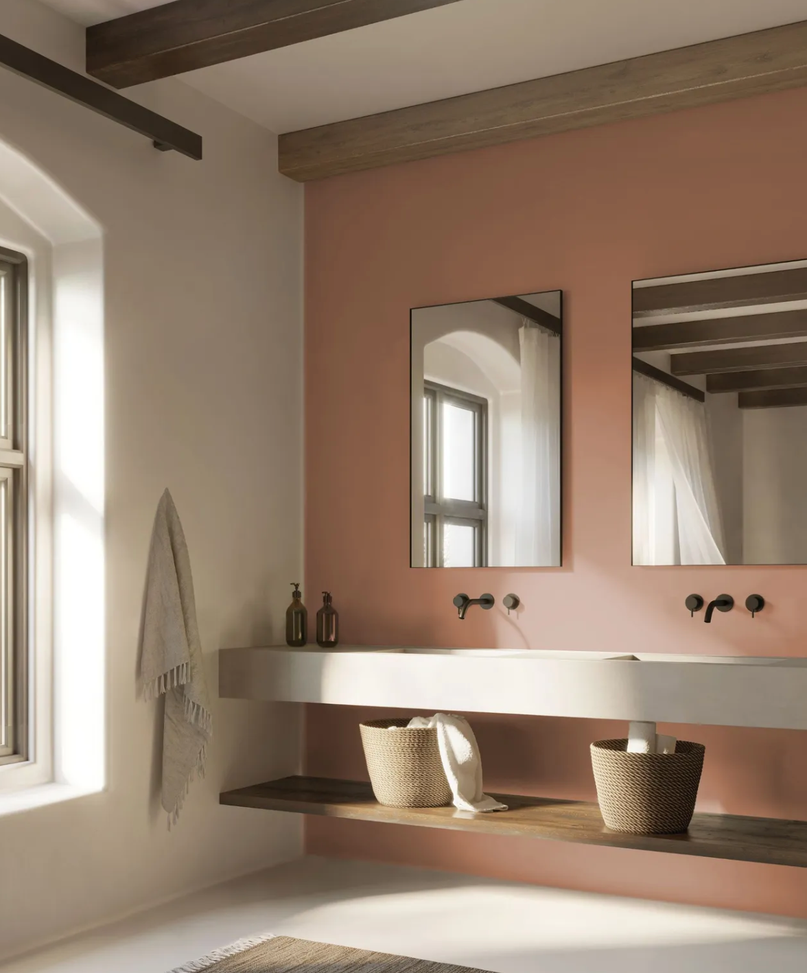 Землисто-теракотовий. У 2025 році в рожевих ванних кімнатах переважає землистий і приземлений теракотовий декор. Землистий відтінок створює затишну та привабливу атмосферу. Теракотовий колір чудово поєднується з природними матеріалами, такими як дерево та камінь, створюючи гармонійну естетику, яка сприяє розслабленню.
