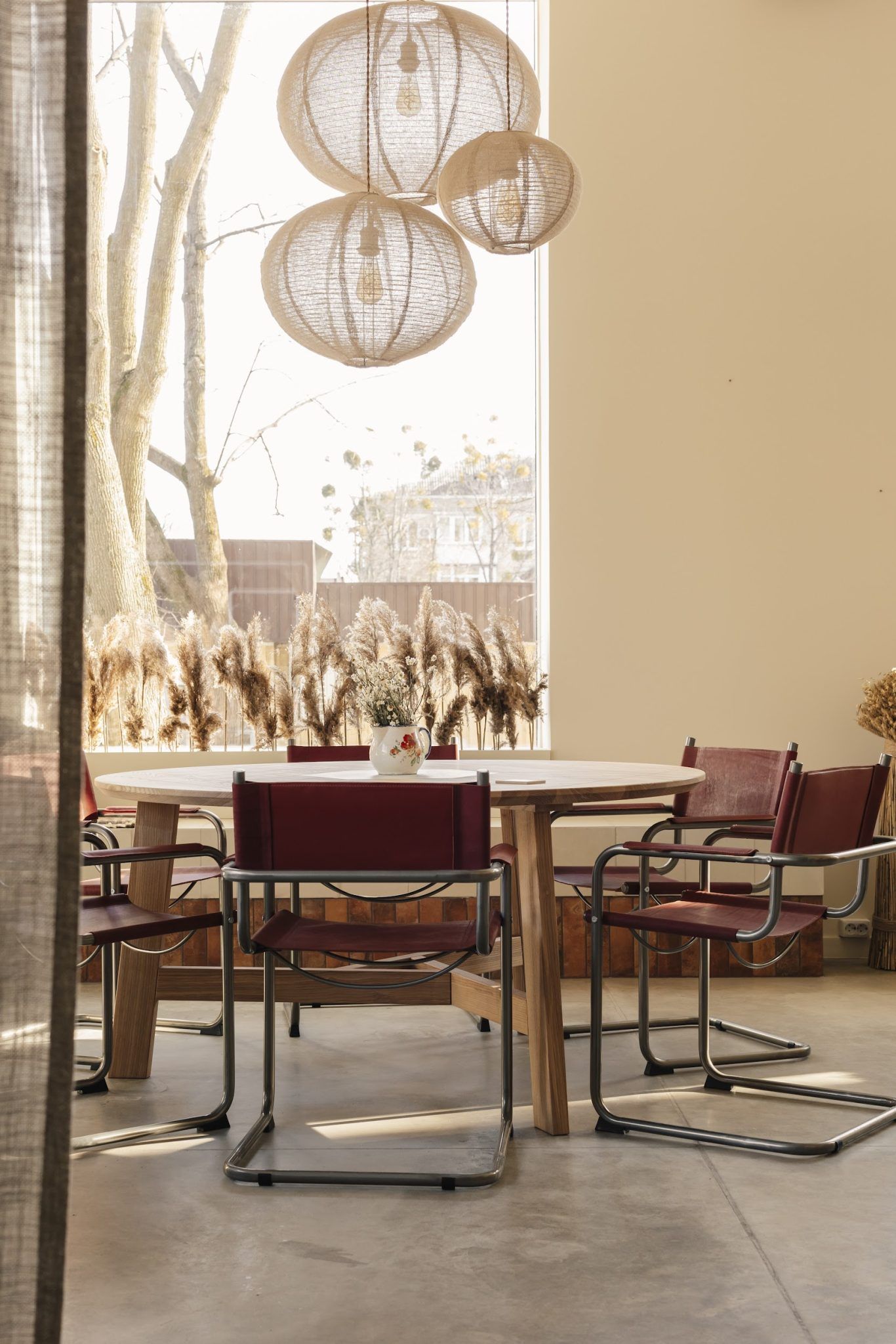 Архітекторка поділилася, що в одному із проєктів її команда використала червоний колір у меблях, для стільців за спільними столами. За допомогою кольору акцентується увага на цій зоні. Мікс червоних стільців із класичними деревʼяними та хромованими металевими створюють контраст традицій та сучасності, який робить елементи дизайну ще більш виразними.