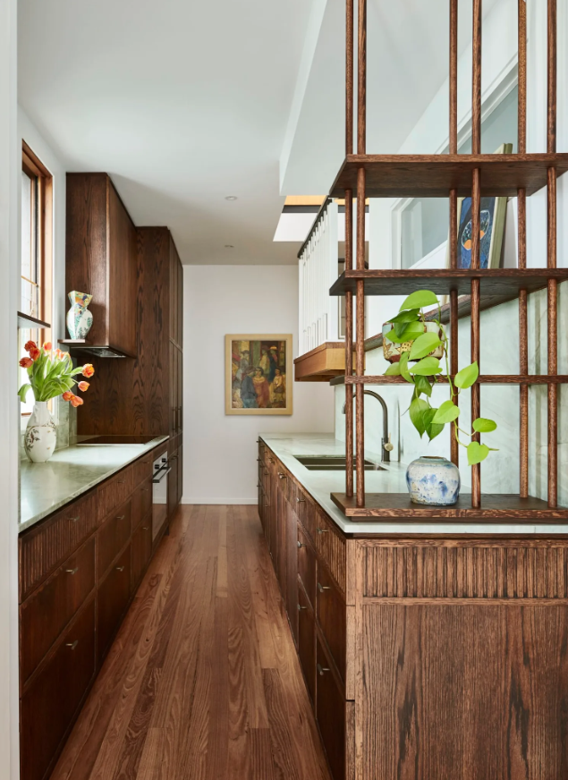 Як завзята колекціонерка мистецтва, господиня прагнула мати місце для демонстрації улюблених робіт. Це стало можливим завдяки відкритим дерев'яним полицям, які також візуально розширили вузький простір.