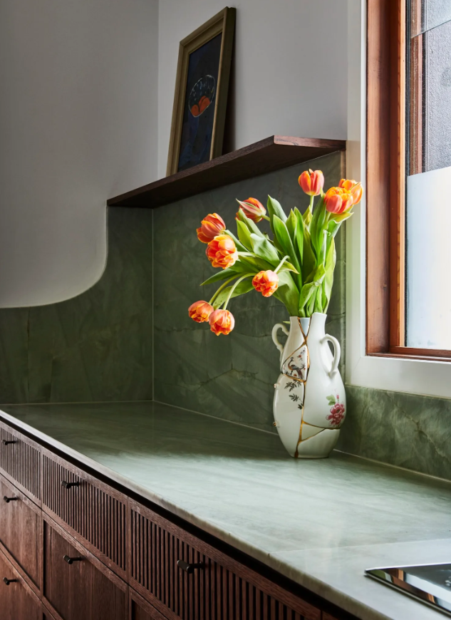 Використання світло-зеленого кварциту на стільниці та фартусі додало простору кольору, ніжного малюнку прожилок і вишуканої краси / Фото Lisa Cohen