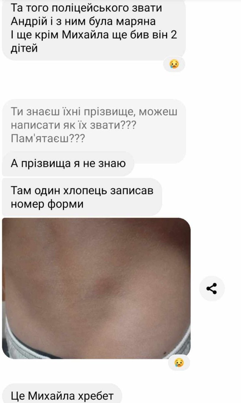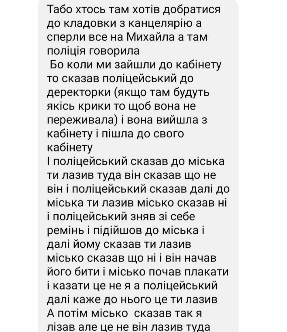 Також вихованці повідомили, що поліціянт бив ще інших двох дітей. Вони розказали, що перед тим, як побити Михайла, правоохоронець попередив директорку закладу, щоб, мовляв, вона не переживала, якщо буде чутно якісь крики. Після чого та пішла собі до кабінету.