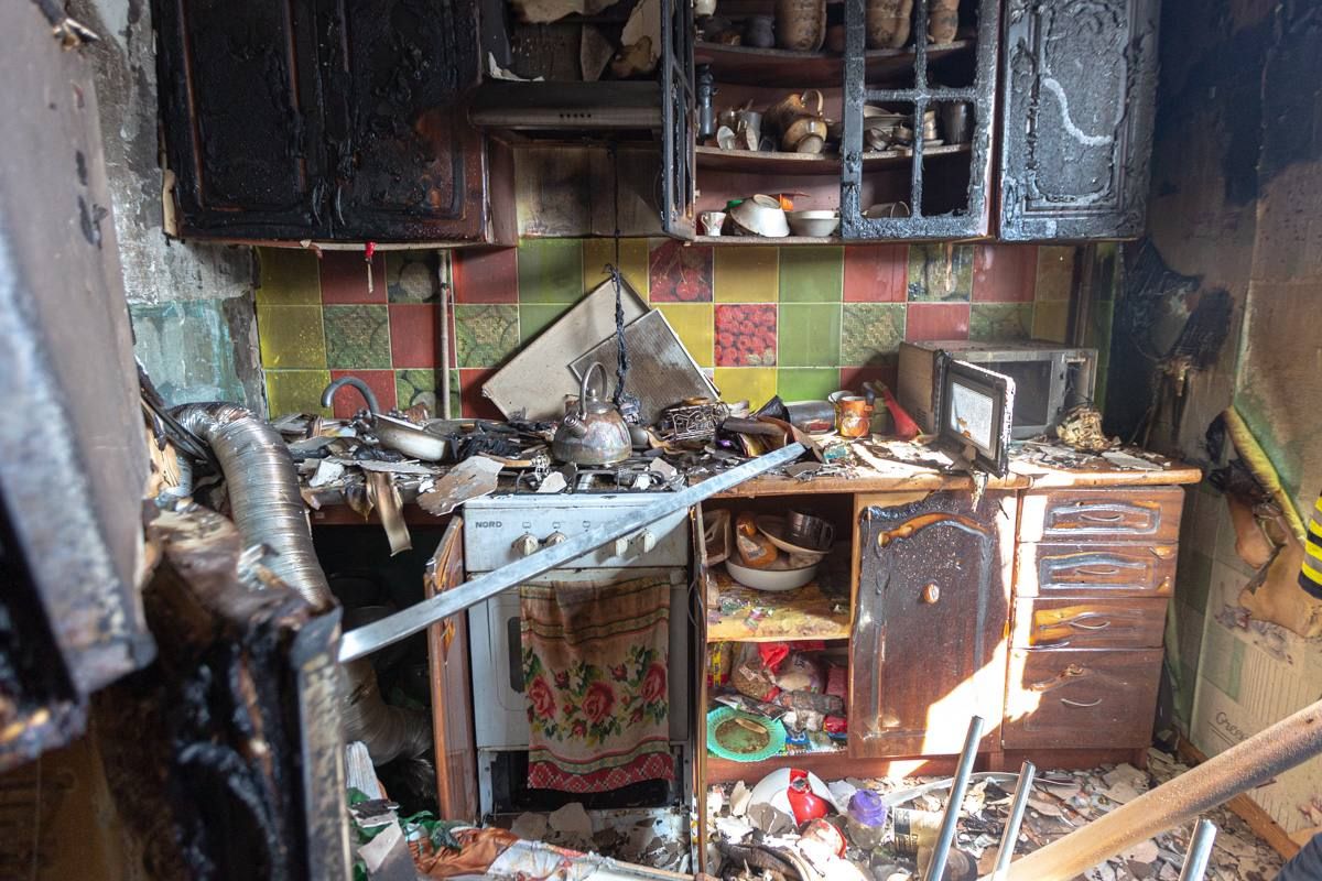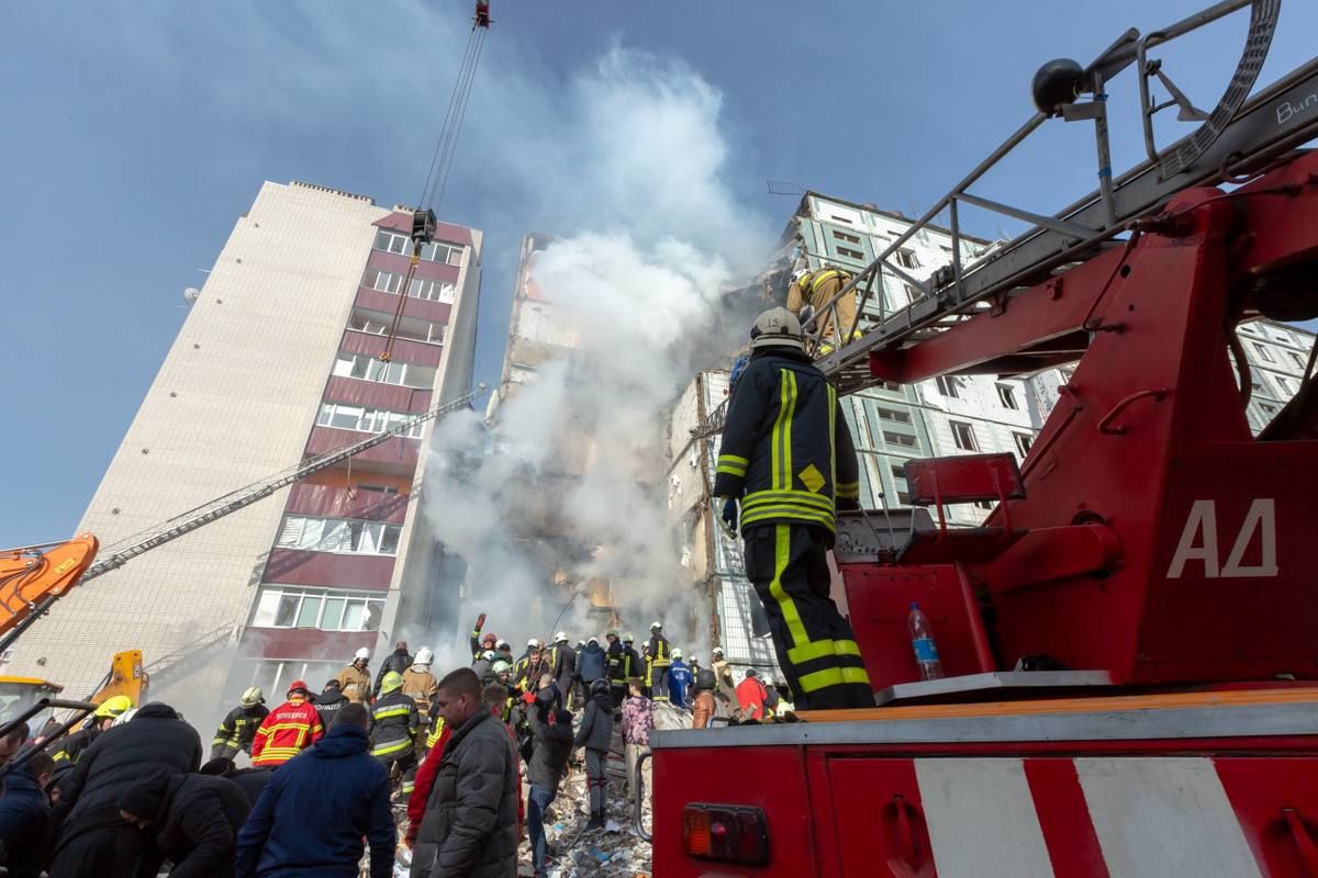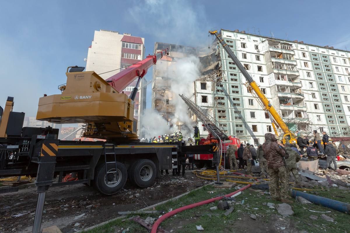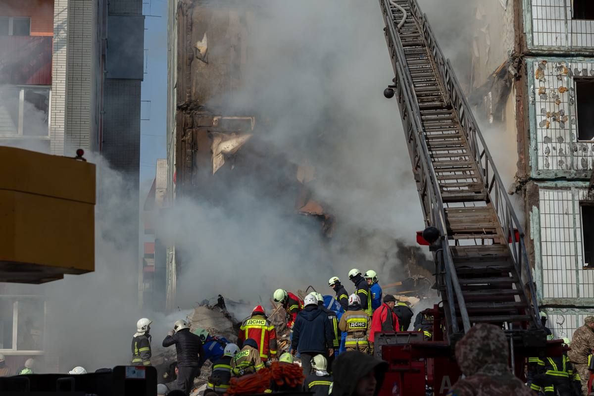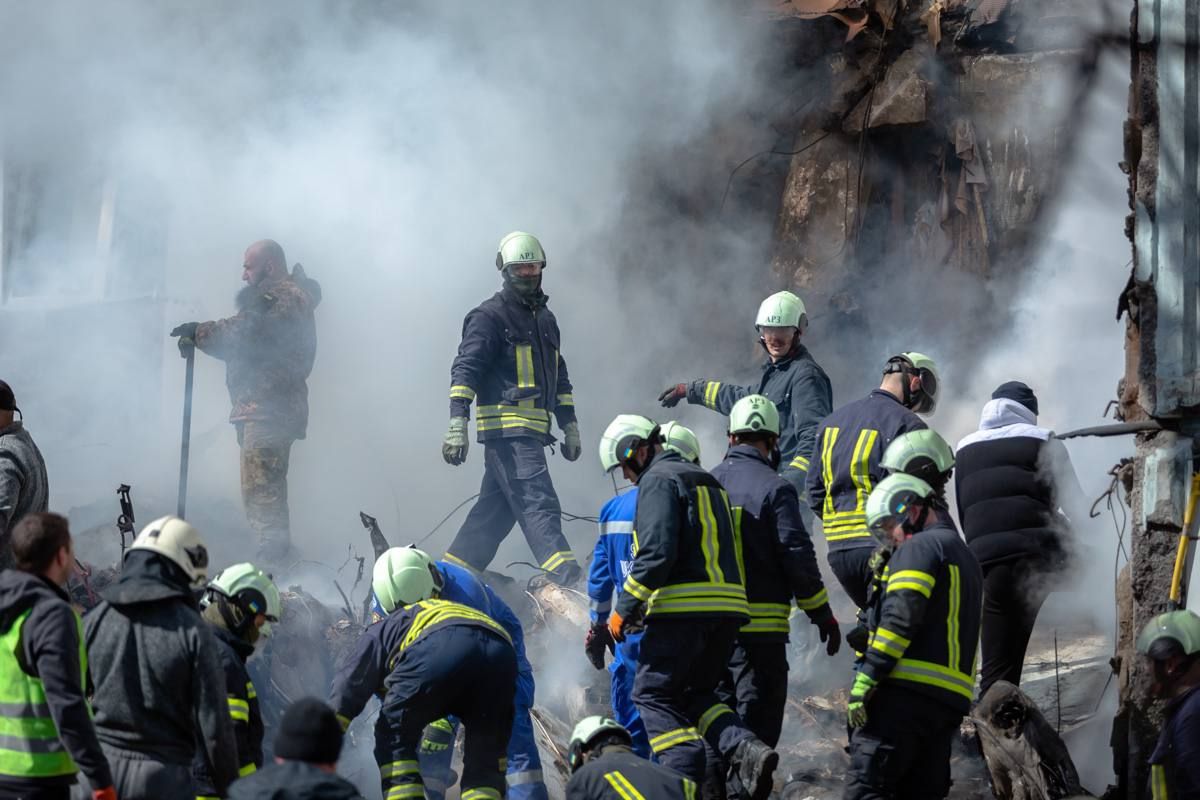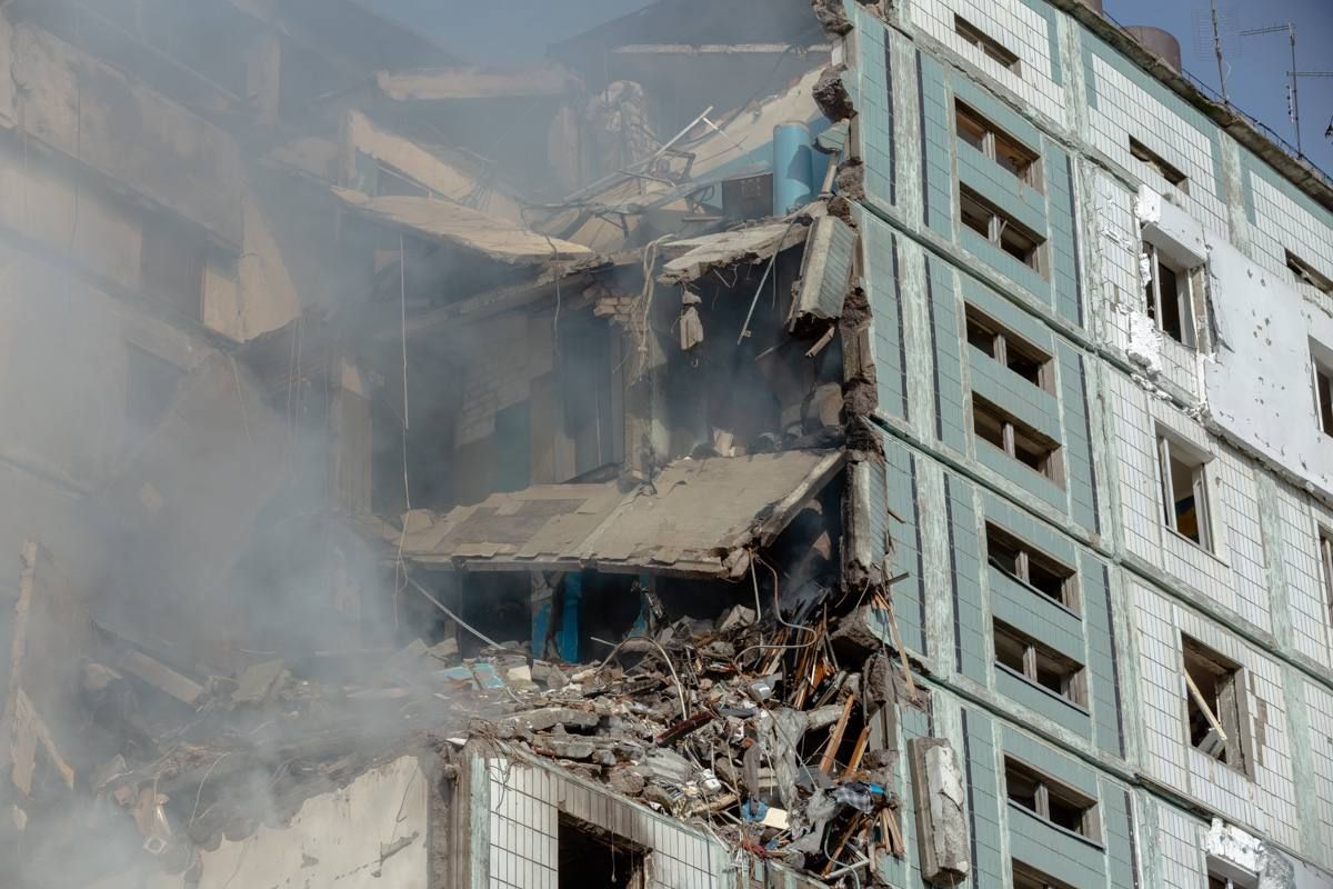 Одна з ракет зруйнувала під'їзд у будинку на вулиці Комарова. Як повідомив Президент України, розбір завалів триває і досі.