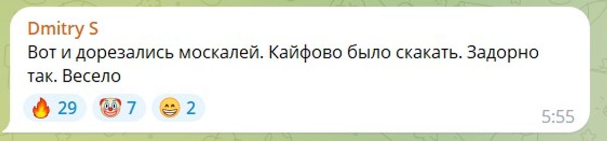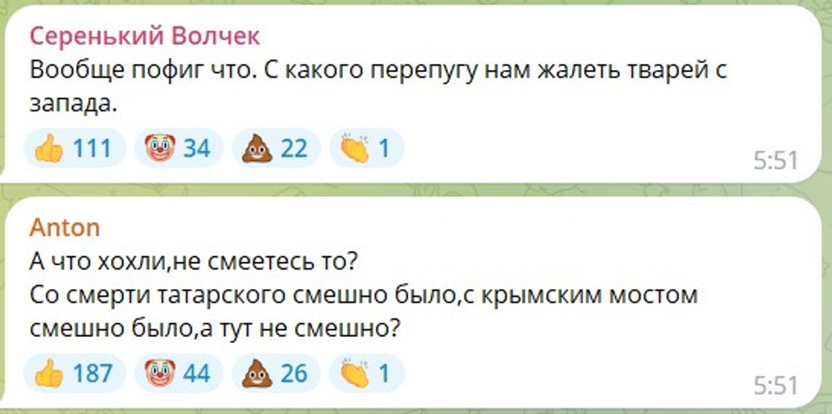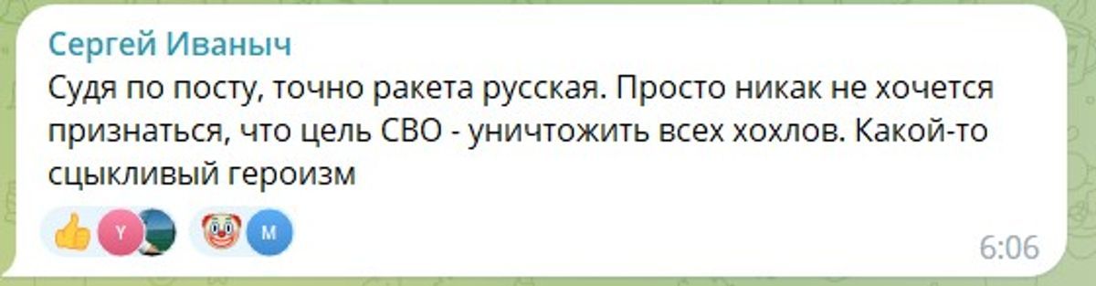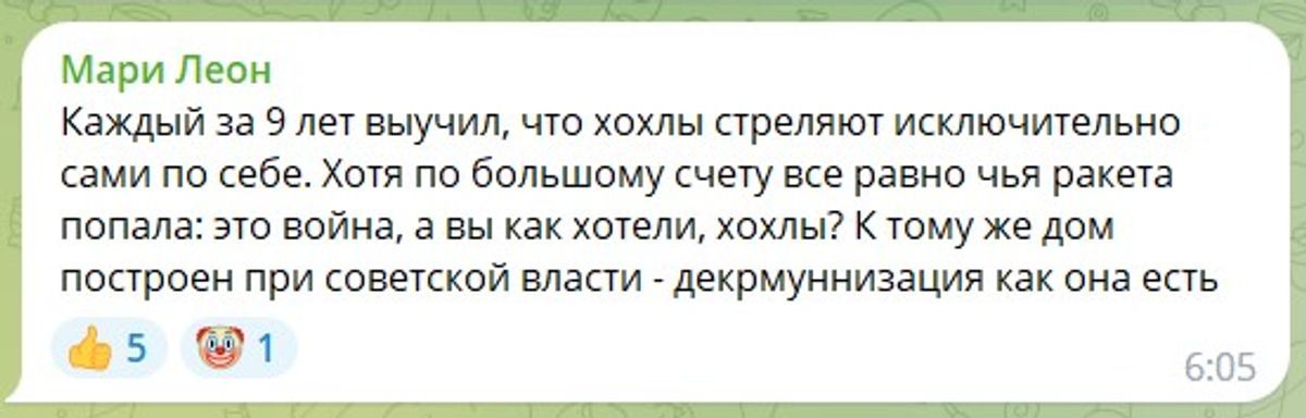 Цивільні, пересічні росіяни у соцмережах оперативно відреагували на ракетний удар по Умані, який Росія завдала серед ночі по багатоповерховому будинку, де спали сім'ї з дітьми. Своїми коментарями вони вчергове підтвердили, що смерті нашому народу бажає не лише Путін з Шойгу, Пригожиним та їм подібні а населення сусідньої терористичної держави.