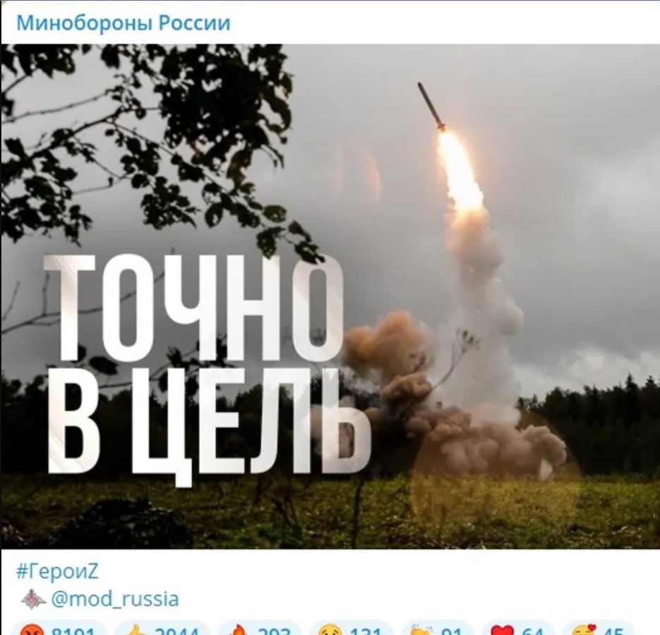 Звісно, підтримало всі ці кровожерливі настрої і в "міністерстві війни" Росії. У своїх соцмережах вони опублікували цинічний постер "Точно в ціль" після влучань у цивільні об'єкти в Україні.