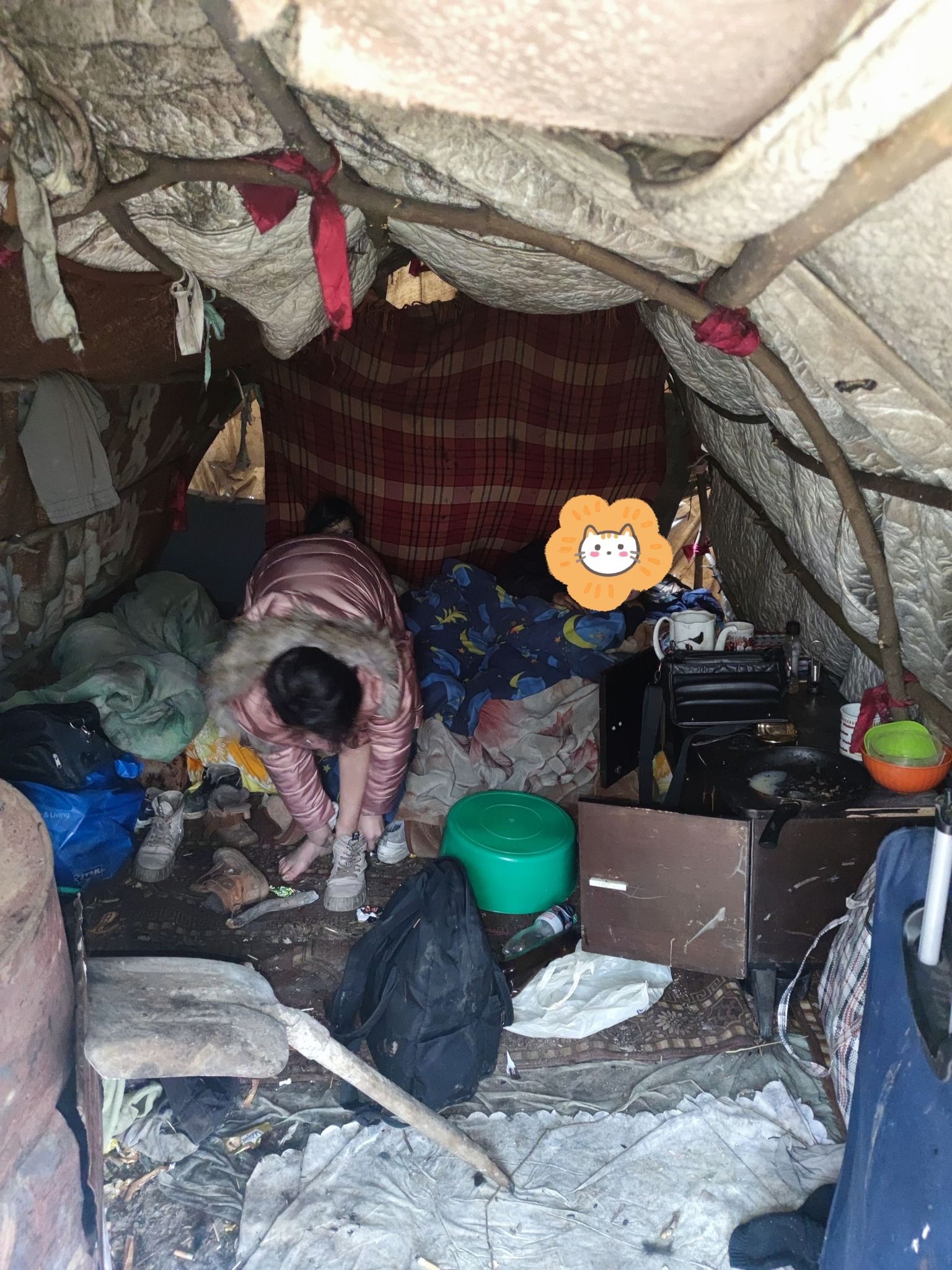У хижі, яка створена з кількох палок, збитих цвяхами, та обтягнена аграрною плівкою, діти спали на землі. Там лежали лише брудні матрац та килимок. Крім того, діти ходили босоніж, бо не мали ані взуття, ані шкарпеток.