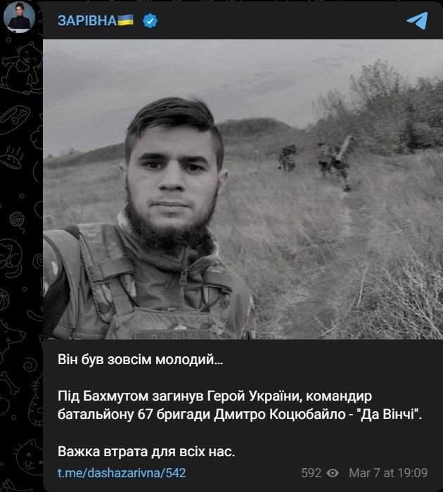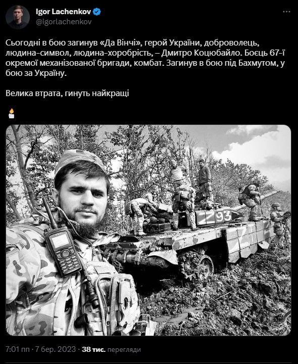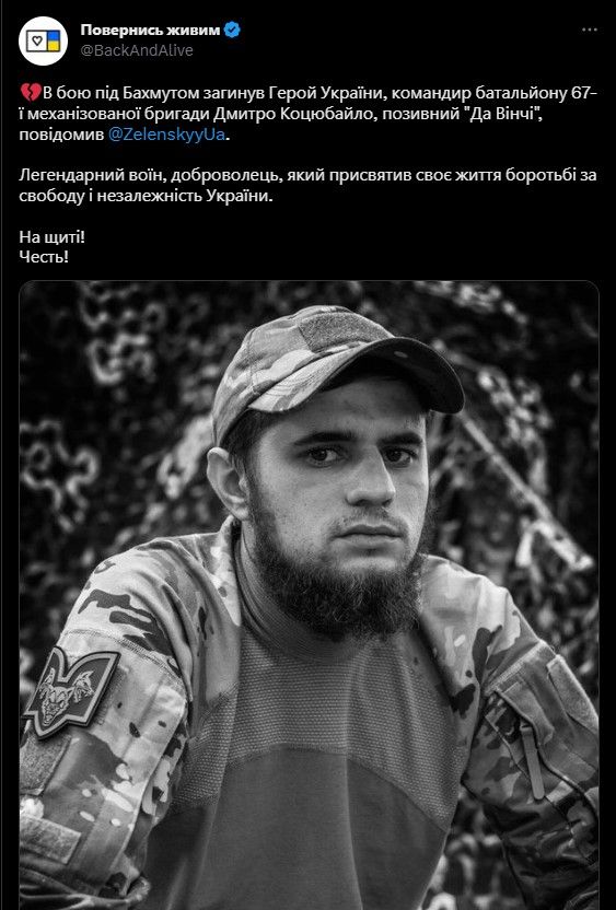 1-ша окрема штурмова рота Добровольчого українського корпусу "Правий сектор" повідомила, що Дмитро "Да Вінчі" Коцюбайло жив і загинув як Герой. Він усе своє свідоме життя присвятив боротьбі, у 18 пішов на фронт та загинув зі зброєю в руках, першим ідучи в бій.