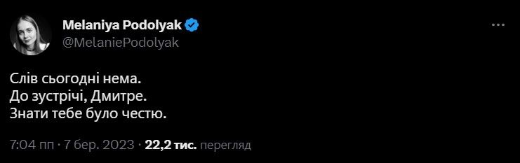 Це величезна втрата для нас усіх, для нашої країни та сил оборони. Вічна слава та честь великій Людині. Герої не вмирають,