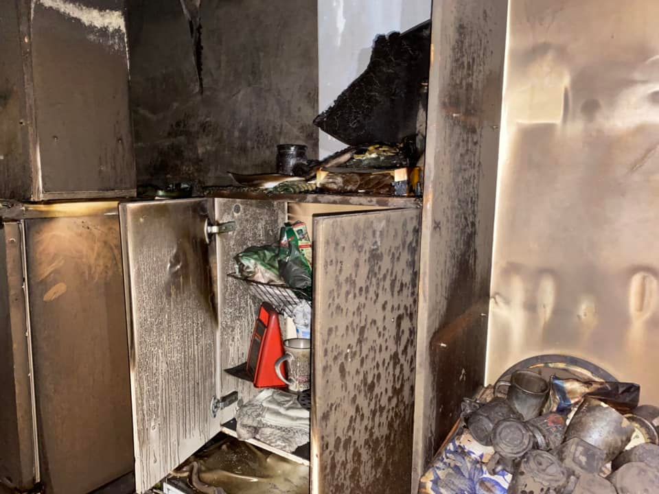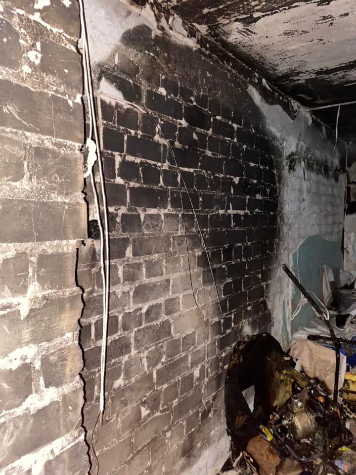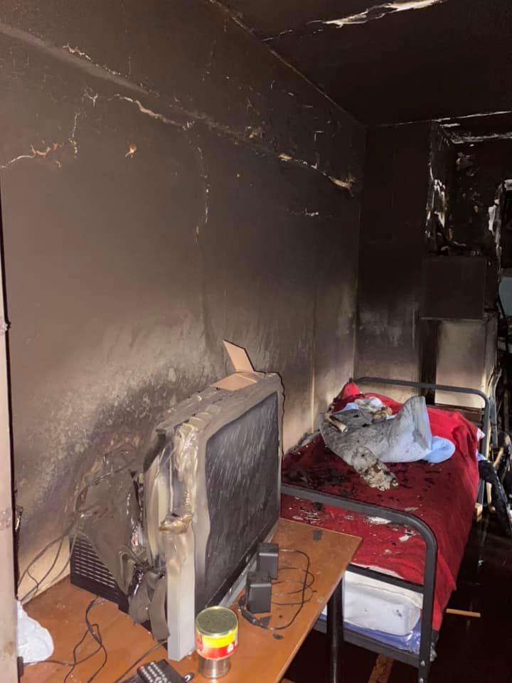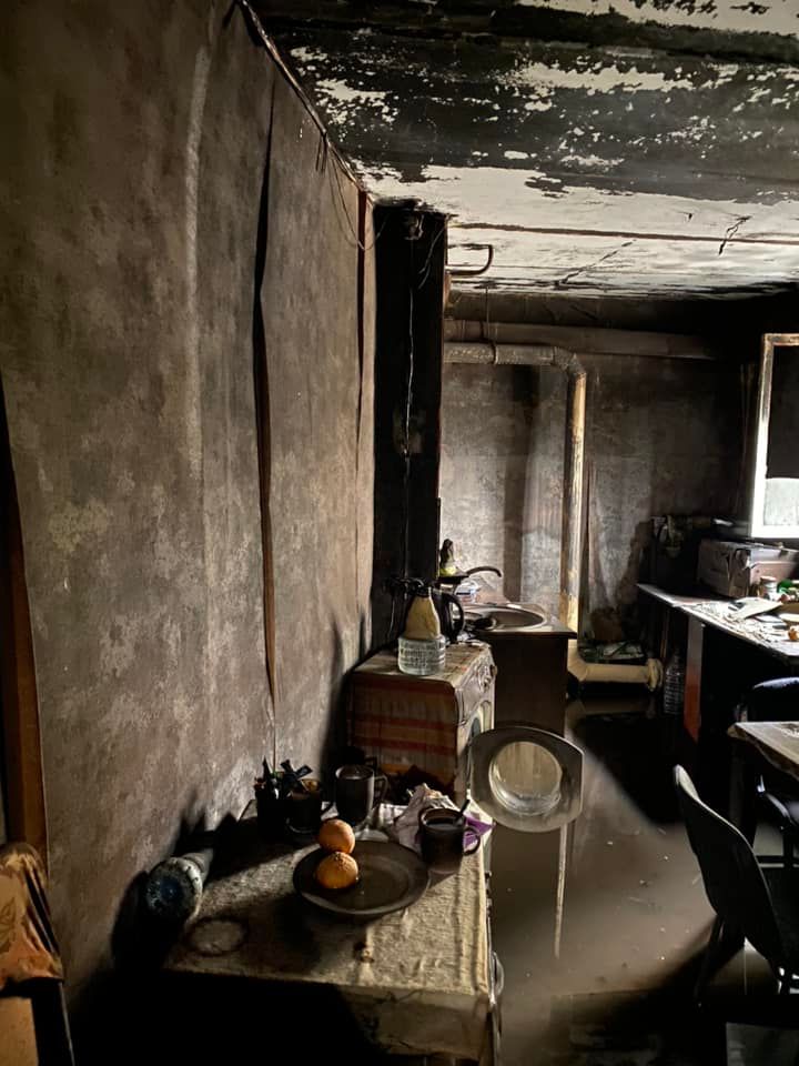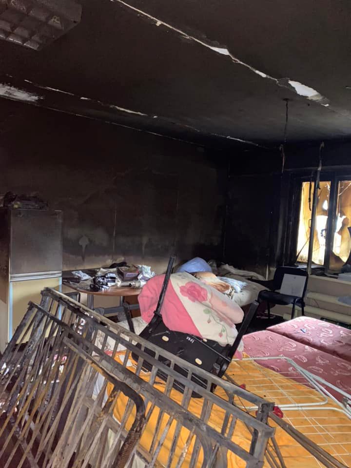 Шелтер для вимушених переселенців облаштували на цокольному поверсі житлового будинку. Внаслідок пожежі у раніше затишному прихистку тепер чорні від сажі стіни, меблі та згоріла техніка. Керівник шелтеру розповів, що приміщення вигоріло вщент.