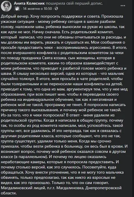 Про інцидент розповіла його мама Аніта Колесник у соціальній мережі. Це сталося у Магдалинівському ліцеї ім. Азамата Айталіева ще 14 жовтня – на День захисника і захисниць України.