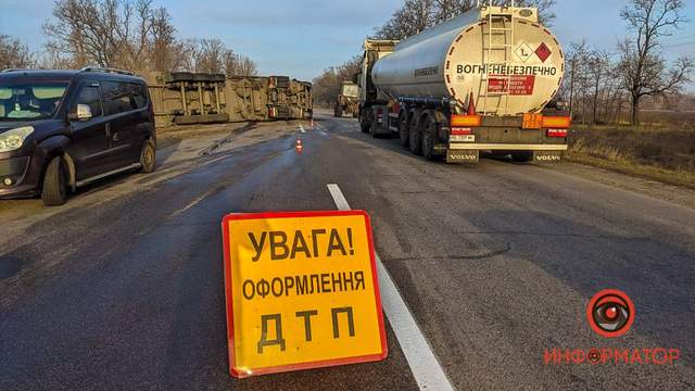 Внаслідок ДТП заблокований проїзд у бік Дніпра в районі повороту на село Іванівка, одна смуга зайнята. О 10:00 фуру повинні були забрати з дороги.