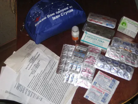 В чохлі з написом "Бажаю вам здоров'я! Іван Ступак" зібрано медикаменти для людей з серцево-судинними захворюваннями: дротаверин, аспетер, папазол, валідол, аспаркам, корвалтаб, нітрогліцерин, а також парацетамол, цитрамон і анальгін.
