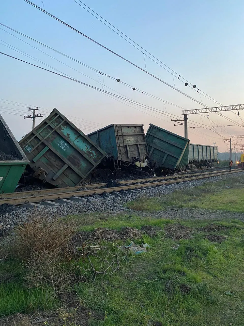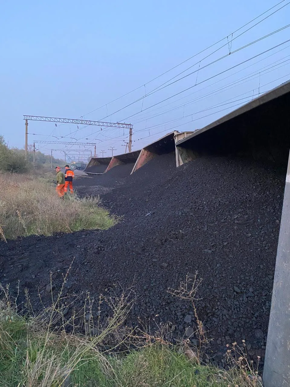 Вагони, які зійшли з рейок, були навантажені сипким вантажем чорного кольору – ймовірно, вугіллям. Внаслідок аварії воно розсипалося у приколійній смузі.
