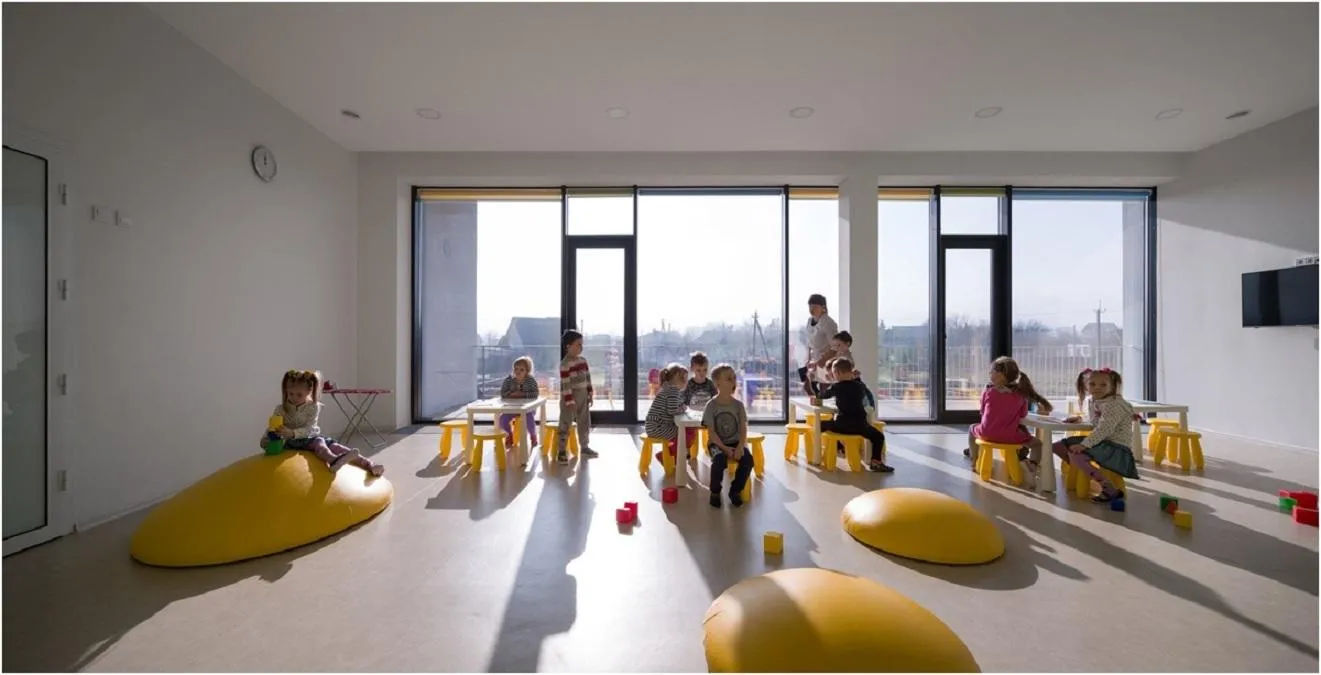 Садок в Обухівці має цілий ряд характеристик, що відрізняють його від стандартного українського освітнього закладу. Зокрема, особливістю проєкту стали вікна в підлогу.
