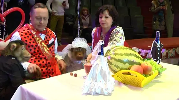 Мавпи були одягнуті вишукано, по-святковому. Дотримались організатори майже всіх весільних традицій – були і шампанське, і коровай. Єдине, що молодята не схотіли одягати обручки.