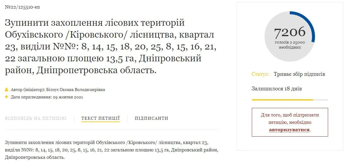 Также 29 октября была создана электронная петиция "Остановить захват лесных территорий Обуховского/Кировского/лесничества" на сайте представительства президента Украины. По состоянию на 11 января там есть 7200 голосов из 25 тысяч необходимых для рассмотрения президентом.