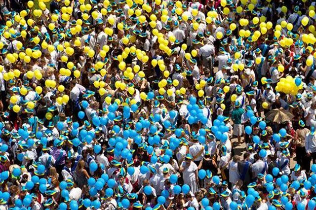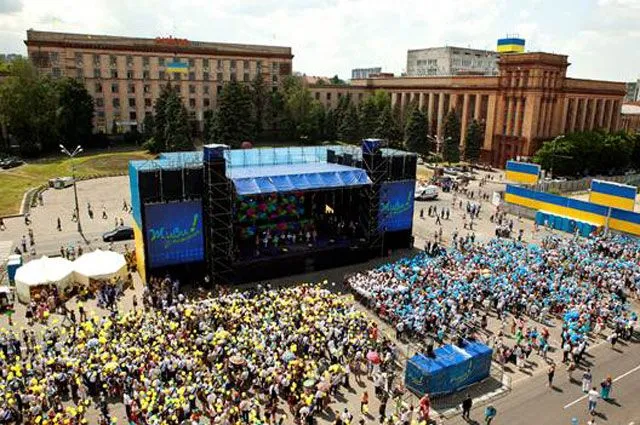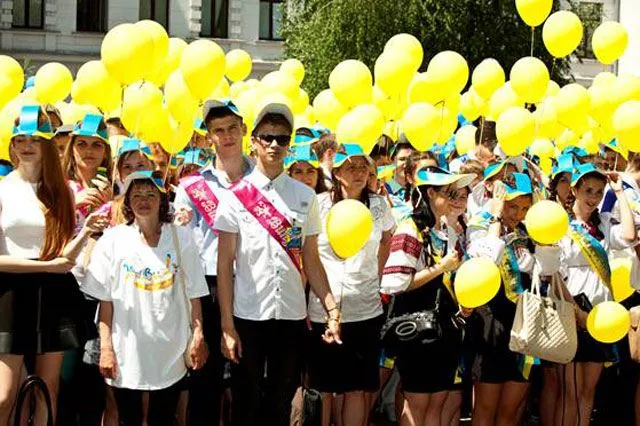 На центральной площади Днепропетровска выпускники отпустили в небо более 5 тыс. воздушных желто-голубых шариков как символ веры в Украину, мира на родной земле и веры в счастливое будущее.