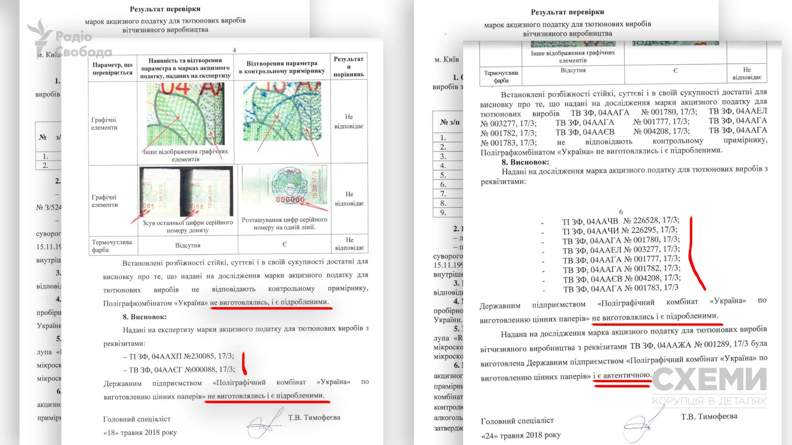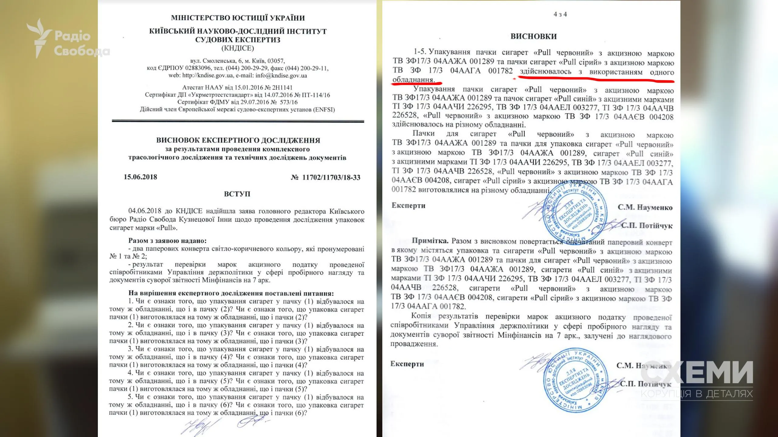 Другая, трасологическая экспертиза, которую заказали журналисты в Киевском научно-исследовательском институте судебных экспертиз, показала, что упаковка пачки с оригинальной акцизной маркой "Юнайтед Табако" и поддельной акцизной маркой происходила на одном оборудовании.
