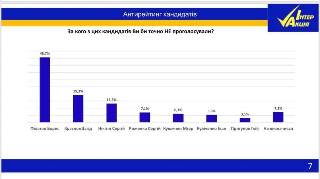 Выяснили социологи и антирейтинг кандидатов в мэры Днепра: Борис Филатов – 45,7%, Загид Краснов – 19,3%, Сергей Никитин – 13,3%, Серей Рыженко – 7%.