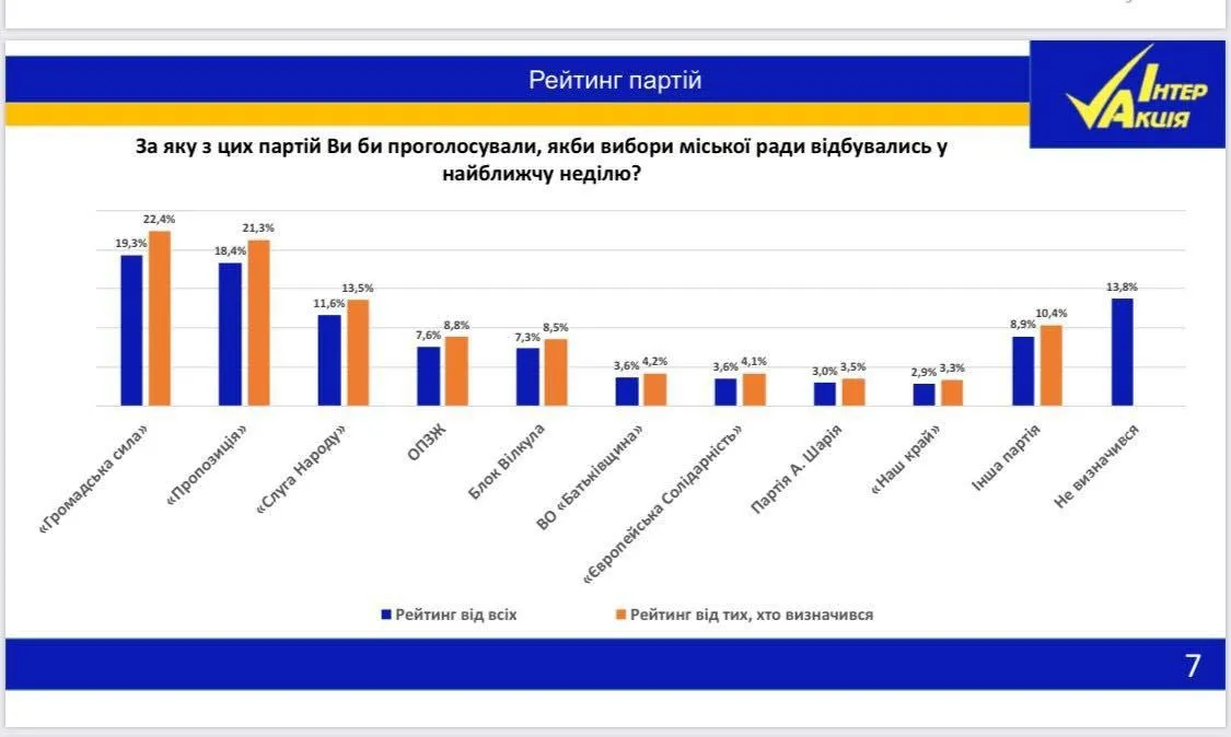 Среди тех, кто уже определился со своим выбором, среди политических партий предпочтения горожан расположились в таком порядке: "Громадська сила" – 22,4%, "Пропозиція" – 21,3%, "Слуга народа" – 13,5%, ОПЗЖ – 8,8%, "Блок Вілкула" – 8,5%.