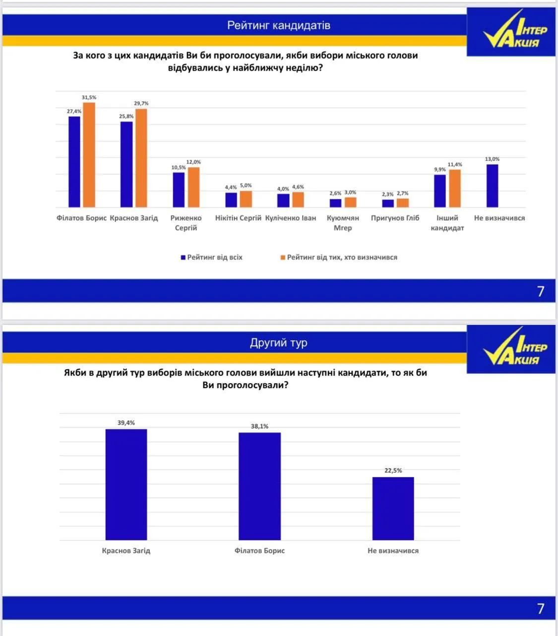В первом туре выборов мэра кандидаты расположились бы следующим образом: Борис Филатов – 31,5%, Загид Краснов – 29,7%, Сергій Риженко – 12%, Сергій Никитин – 5%, Иван Куличенко – 4,6%.