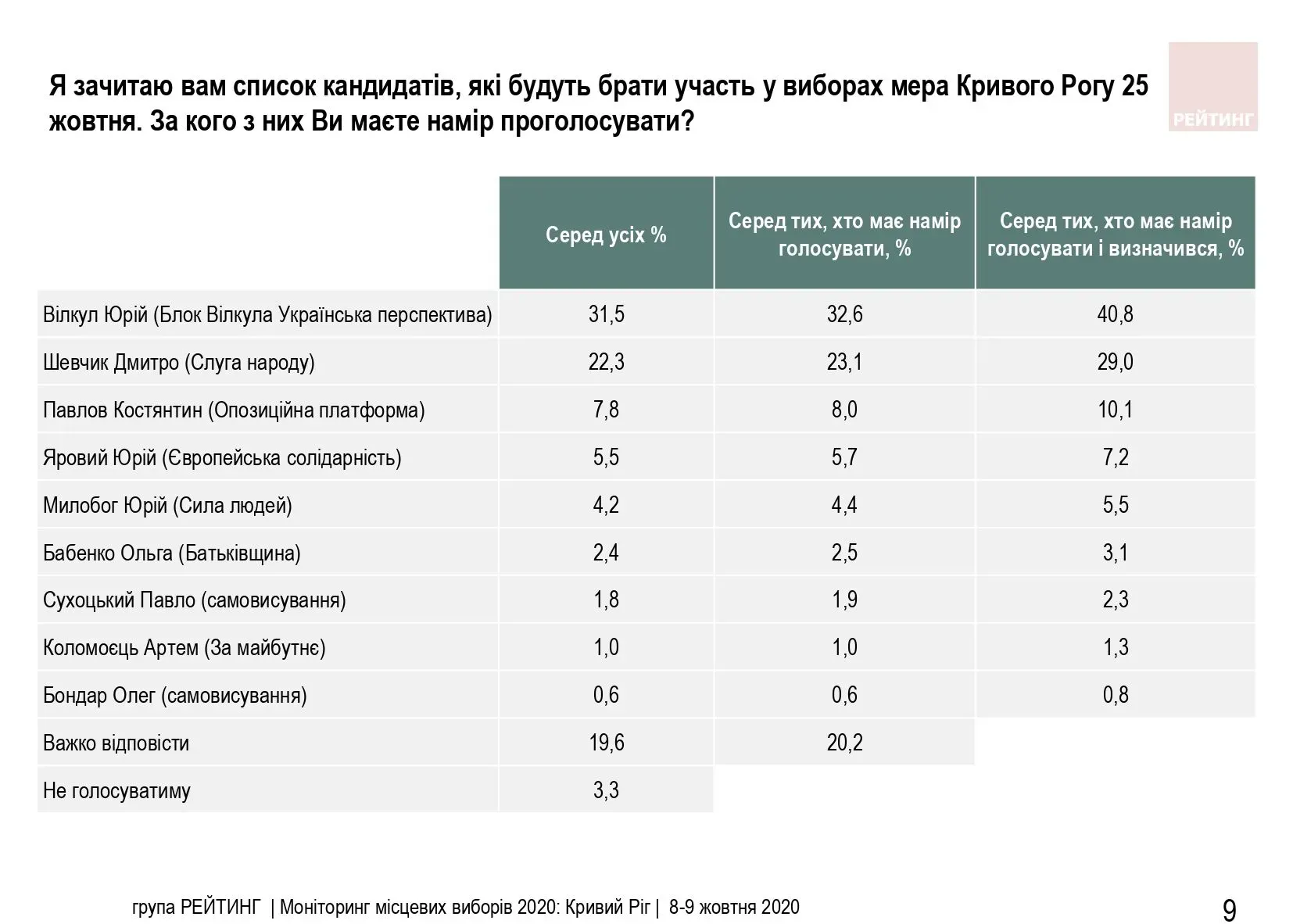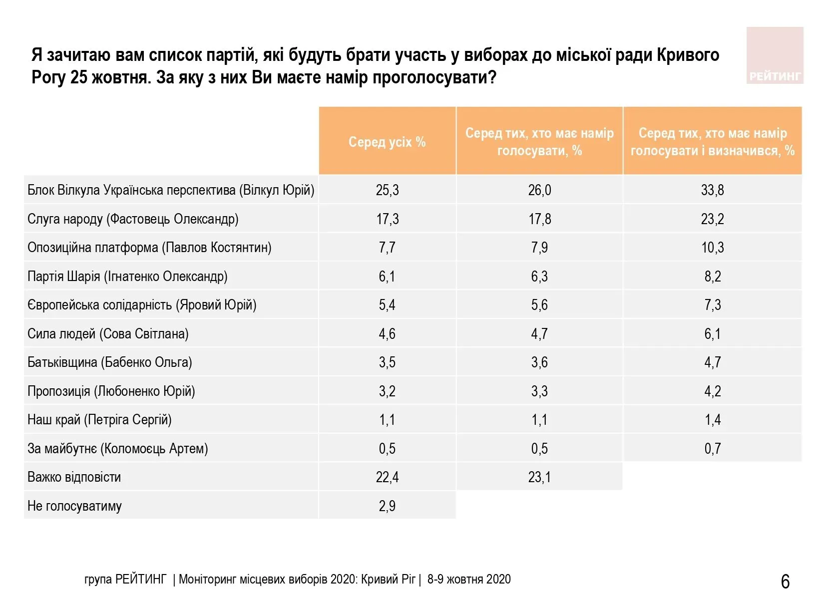 При цьому найбільш спадну динаміку за минулий місяць демонструють "Блок Вілкула" Українська перспектива". Кількість тих, хто має намір голосувати за політичну силу чинного мера, за місяць знизилося на 10% – з 35,9 до 25,3% серед усіх опитаних.