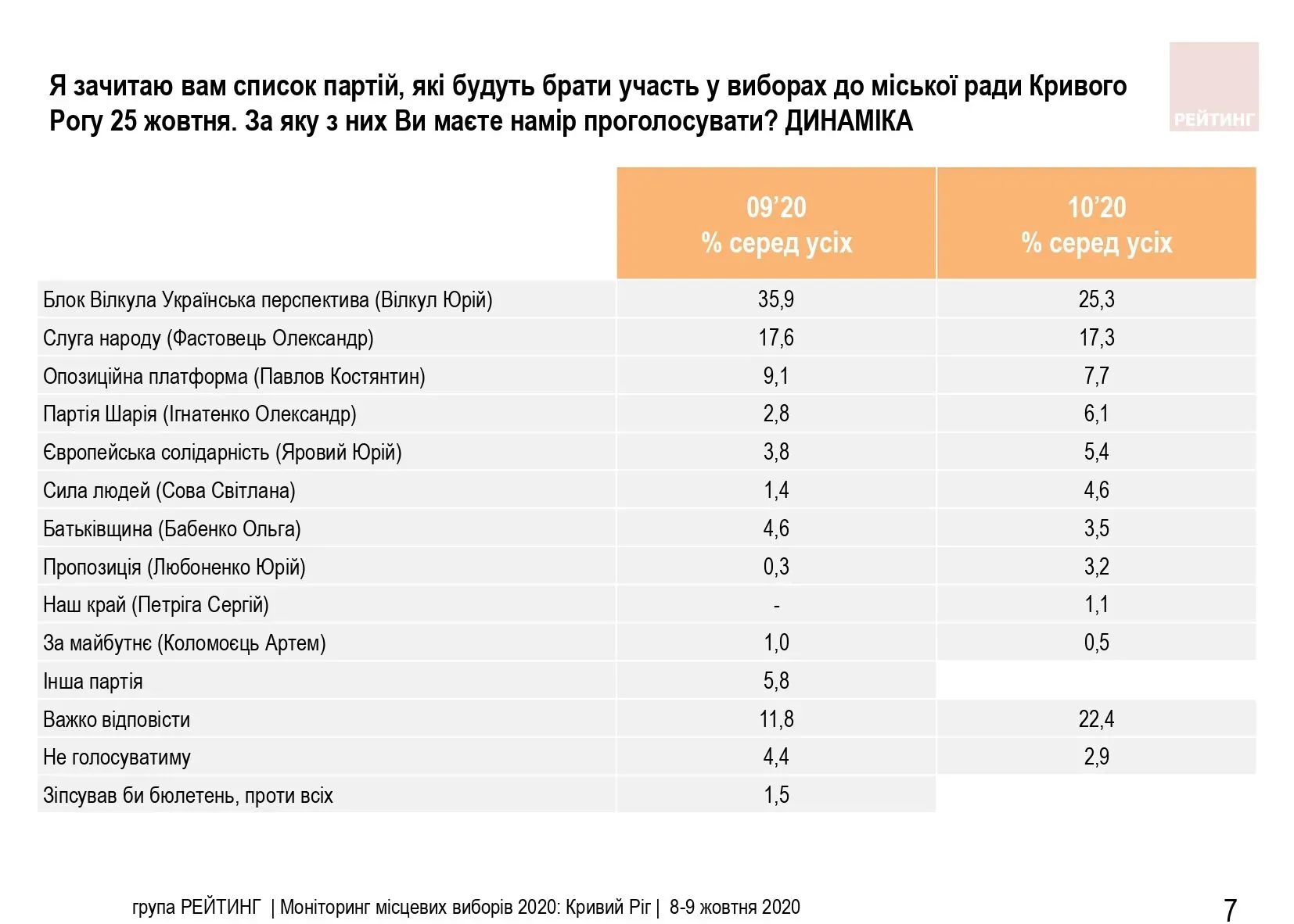 Зросла підтримка "Партія Шарія" (з 2,8 до 6,1%), "Європейської солідарності" (з 3,8 до 5,4%), "Сили людей" (з 1,4 до 4,6%) і "Пропозиції" – з 0,3 до 3,2%. Зростання підтримки останньої пов'язують з Юрієм Любоненко, колишнім мером Кривого Рогу і лідером партії "Пропозиція" в місті.