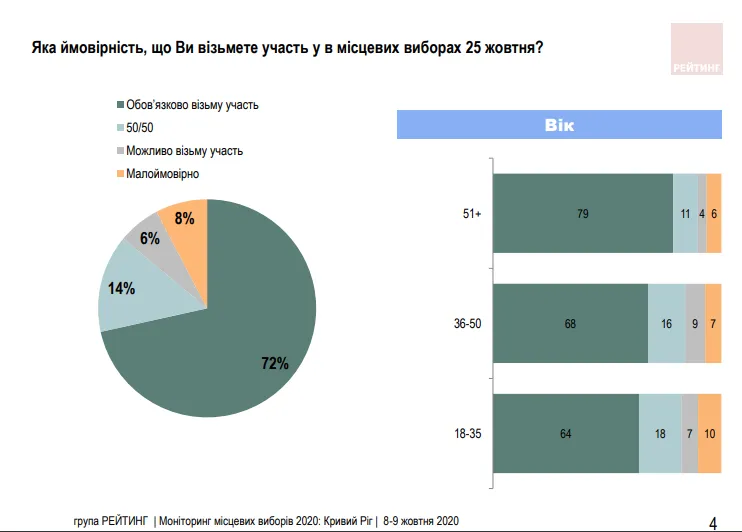 Загалом серед всіх опитаних, 72% відповіли, що будуть обов'язково будуть брати участь у місцевих виборах, які відбудуться 25 жовтня 2020 року. І лише 8% відповіли, що малоймовірно, що прийдуть голосувати.