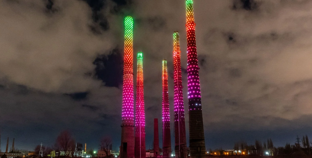 Виданню Designbloom розробники пояснили, що розмістили на заводських трубах світильники та лазери. Потужна техніка дозволяє утворити різноманітні динамічні кольори на будь-який смак.